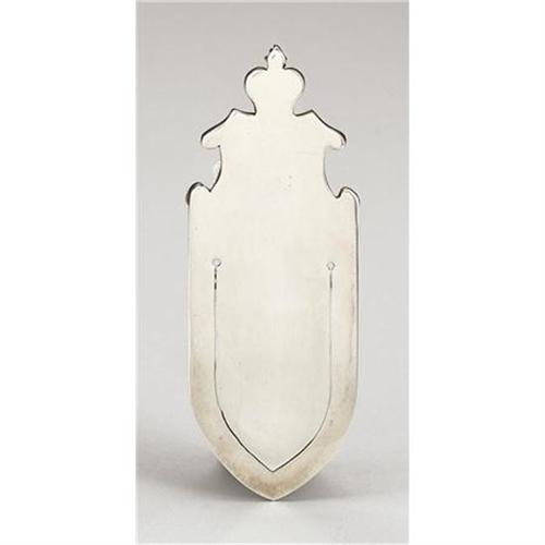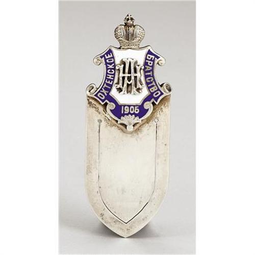 <B>Russian Imperial Silver Jeton Mounted as a Bookmark</B></I><BR><I>Early 20th century</B></I><BR><BR>The shield-shaped silver badge of white enamel applied with the crowned Cyrillic initials <I>NA</B></I> for Nicholas Alexandrovich, Emperor of Russia (r. 1894-1917), the border decorated with Russian inscription<B> </B></I><I>Okhtenskoe bratstvo </B></I>(Okhtenskii brotherhood) on blue enamel with date <I>1906</B></I>, attached to silver bookmark-3 in. long<BR><BR><BR><b>Shipping:</b> Requires 3rd Party Shipping (<a target="_blank" href="http://www.heritageauctions.com/common/shipping.php">view shipping information</a>)