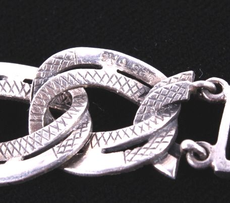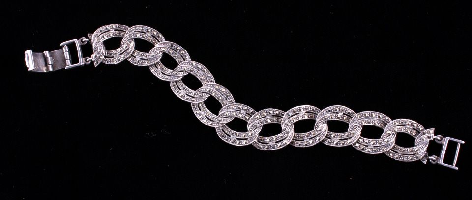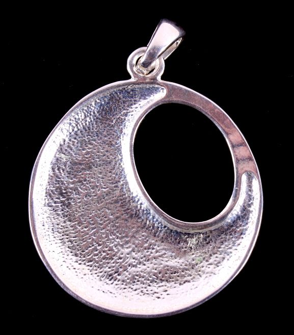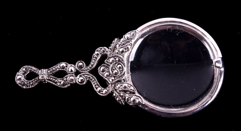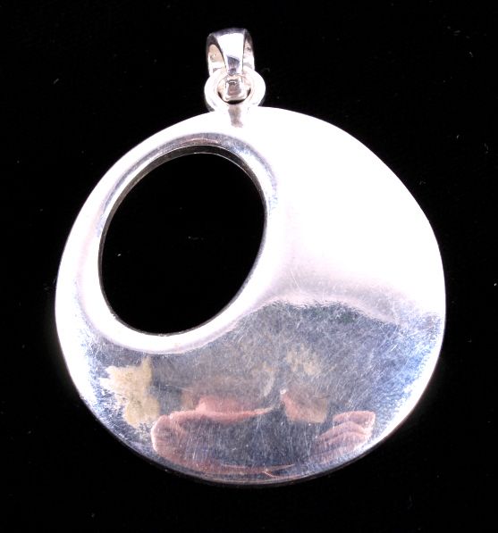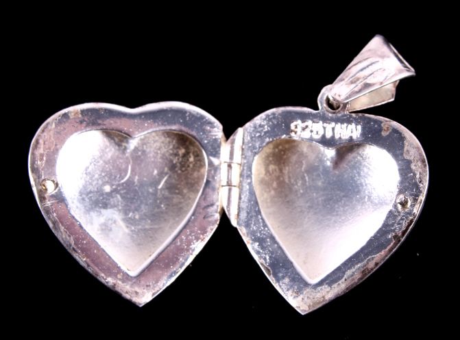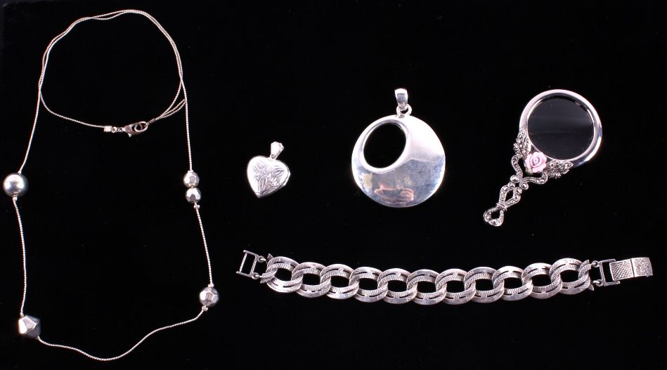 This lot features several silver jewelry pieces. All are believed to be sterling. Included is a pendant (not marked), a fancy bracelet (marked .925), a locket (marked .925), a necklace (not marked), and a fancy eye loupe (not marked). All the jewelry is in very good condition. The pendant is 1.75" in diameter. The bracelet is 7.5" long.