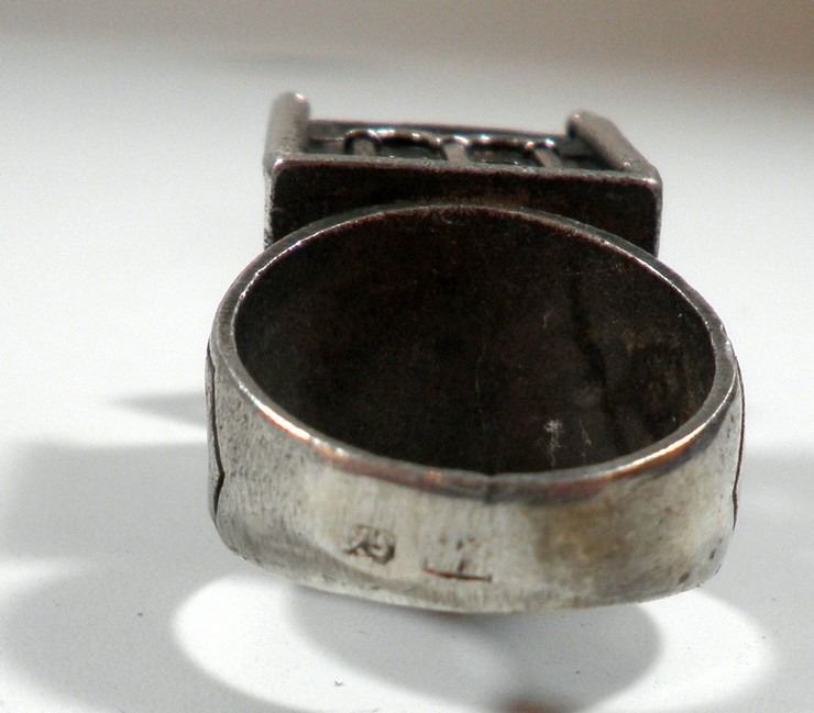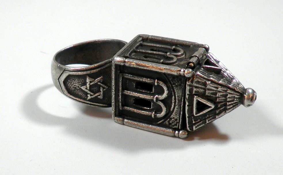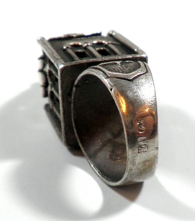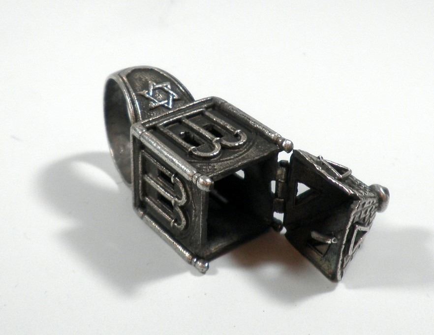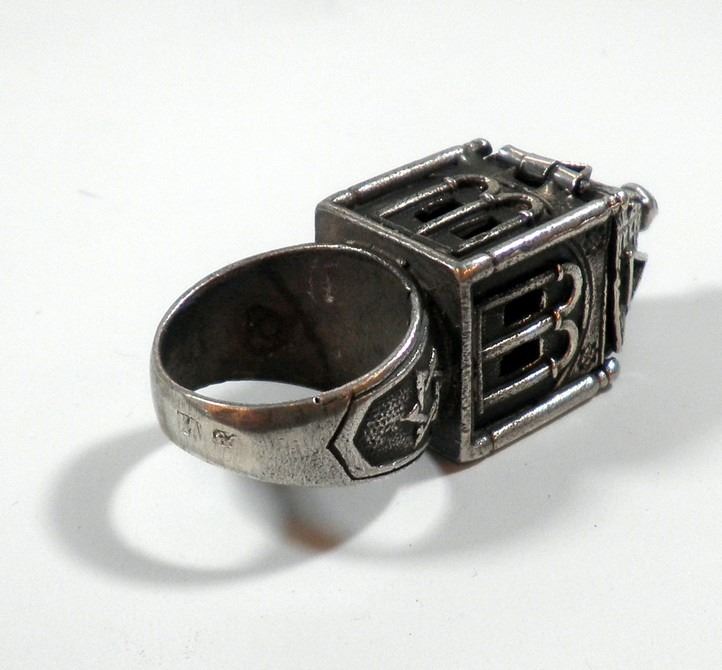 Silver Jewish bridal wedding ring, in the shape of an architectual structure, with roof opening and Stars of David, signed, weight: 40.9 gm, height: 4 cm.