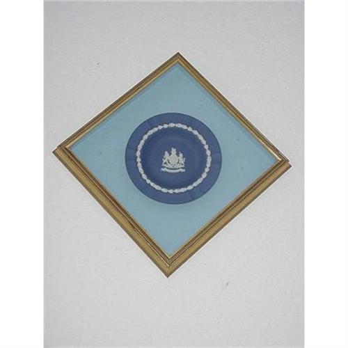 The Silver Jubilee of Elizabeth II marked the twenty-fifth anniversary of Queen Elizabeth II's accession to the throne of the United Kingdom, Canada, Australia, New Zealand, and other Commonwealth realms. It was celebrated throughout 1977. A Wedgwood dark blue jasperware plate, 7" in diameter, with the royal crest and motto 'Dieu et Mon Droit' (God and my right). Framed in a gold shadow box frame, 12 1/4" square, with light blue fabric lining. The condition of the plate is very good, no chips or cracks. The frame is in very good condition, the inside of the glass should be cleaned though. (3)