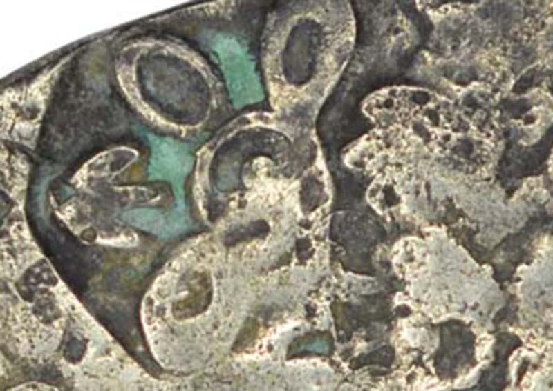 Punchmarked Coins, Kosala Janapada, Silver Karshapana, Obv: five punchmarks, sun, elephant, 6 marked wheel, flowers and floral symbols,rabbit,Rev:countermarks,3.40g, 21.80 X 25.74mm, about very fine, Scarce.Full Rabbit is visible on the coin.