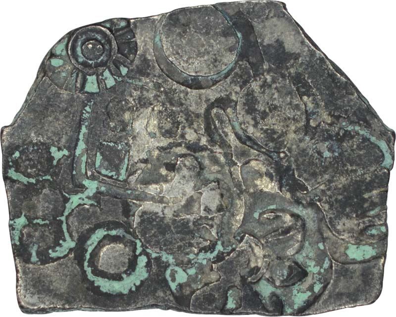 Punchmarked Coins, Magadha Janapada, Silver Karshapana, Obv: sun, elephant, flower and floral designs, Rev: one punchmark, 3.25g, 16.45 X 20.50mm, about very fine.
