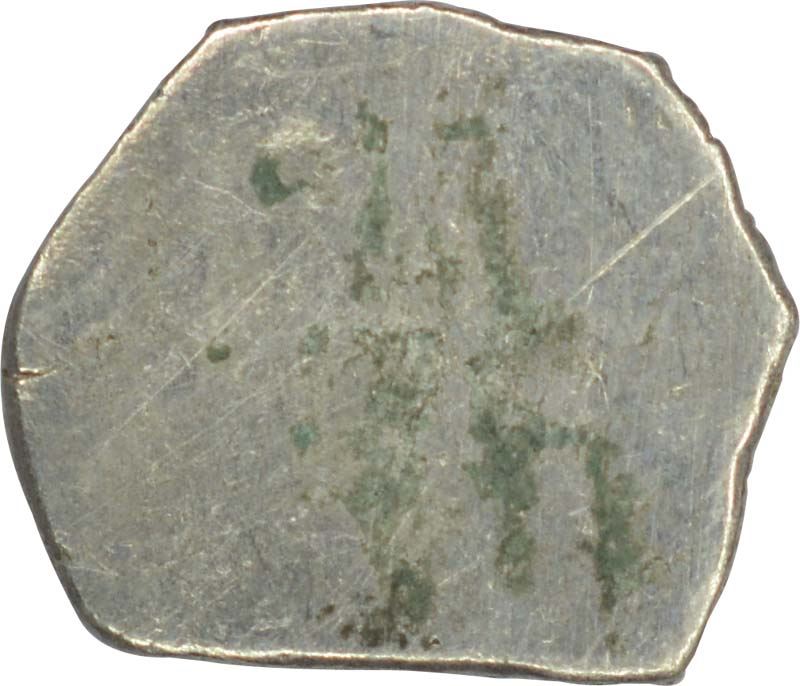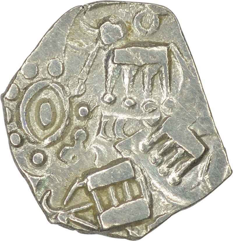 Janapad Silver Punch Mark, Upper Mahanadi Region, (5th B.C.), Silver Karshapana, ABCD configuration of symbols elephant with circle at its back, bullock-cart, animal figure mostly bull and a geometric grain like figure, 1.00g,12.95 X 14.76mm,about extremely fine, Rare.