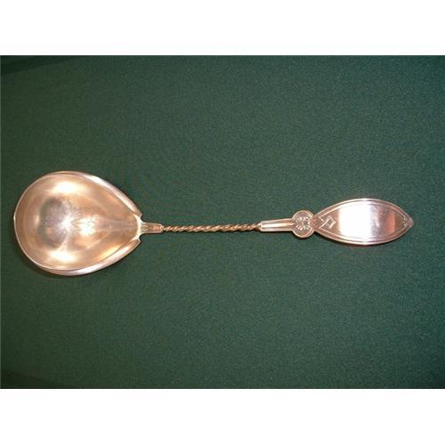 1847 Roger Bros A1 silver Punch ladle. Ornate curved handle, and design ladle bowl. Approx. 12.5 inches long. Very nice. See Item No. 169 for lovely Punch Bowl Set.