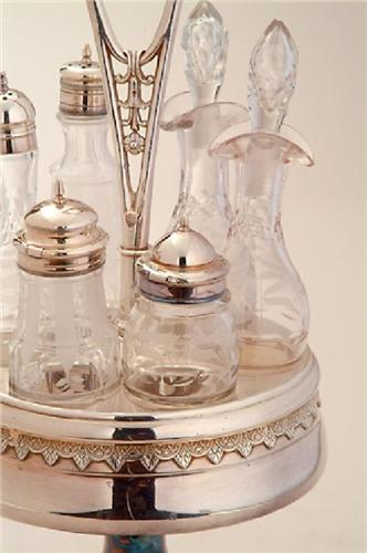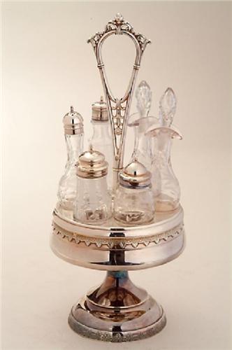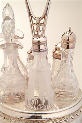 Matching set of six Victorian glass and Silver cruets in stand, late 19th Century.