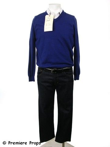 Shea Whigham plays Jake in "Silver Linings Playbook" (2012), the brother of Pat, (Bradley Cooper) who has a mental breakdown, and tries desperately to piece his life together. This is Jake's hero screen worn "Kenneth Cole' off white with black pinstripes, long sleeve, button front dress shirt (size 15 1/2 32-33), Cobalt blue 'Club Room' knit v-neck sweater (size M), 'Joseph Abboud' navy 2 button blazer (size 40s) and 'C of H' dark blue jeans with 'Penguin' black leather belt with silver buckle. Pair of 'Hugo Boss' black wing tip dress shoes (size 10).