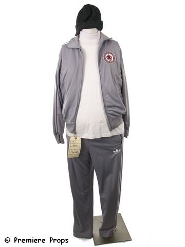 Pat (Bradley Cooper) screen worn 'Adidas' track suit. 'Adidas' silvery/gray track jacket with white stripes (size M) and "South Darby High School" patch, 'Adidas' slivery/gray track suit running pants with white stripes (size M), charcoal wide rib knit cap (one size), 'Natural Basix' cream turtleneck t-shirt (size L), thermal top and bottoms with fat padding (size M).