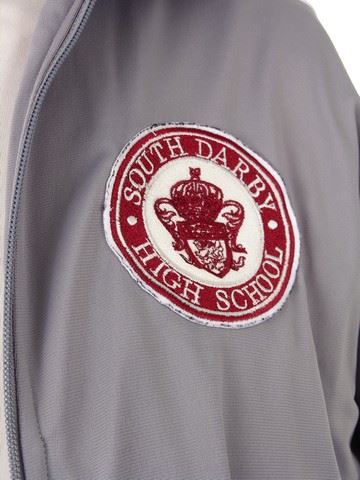 Pat (Bradley Cooper) screen worn 'Adidas' track suit. 'Adidas' silvery/gray track jacket with white stripes (size M) and "South Darby High School" patch, 'Adidas' slivery/gray track suit running pants with white stripes (size M), charcoal wide rib knit cap (one size), 'Natural Basix' cream turtleneck t-shirt (size L), thermal top and bottoms with fat padding (size M).