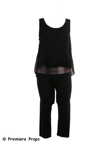 Tiffany (Jennifer Lawrence) has problems of her own, in 2012's "Silver Linings Playbook". Having just lost her husband and perhaps her mind, she finds hope and redemption with equally damaged Pat Solitano (Bradley Cooper). This is Tiffany's screen worn, hero, black zip up the front with brass studs 'Vintage Cotton' hoodie, (size M) black sheer chiffon back, jersey front 'BCBG' tank, (no size or tags) black Capri length 'Lululemon' yoga pants, (size 8) and very worn pink 'Bloch' ballet slippers. Includes wardrobe tag!