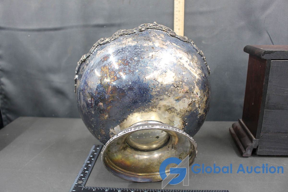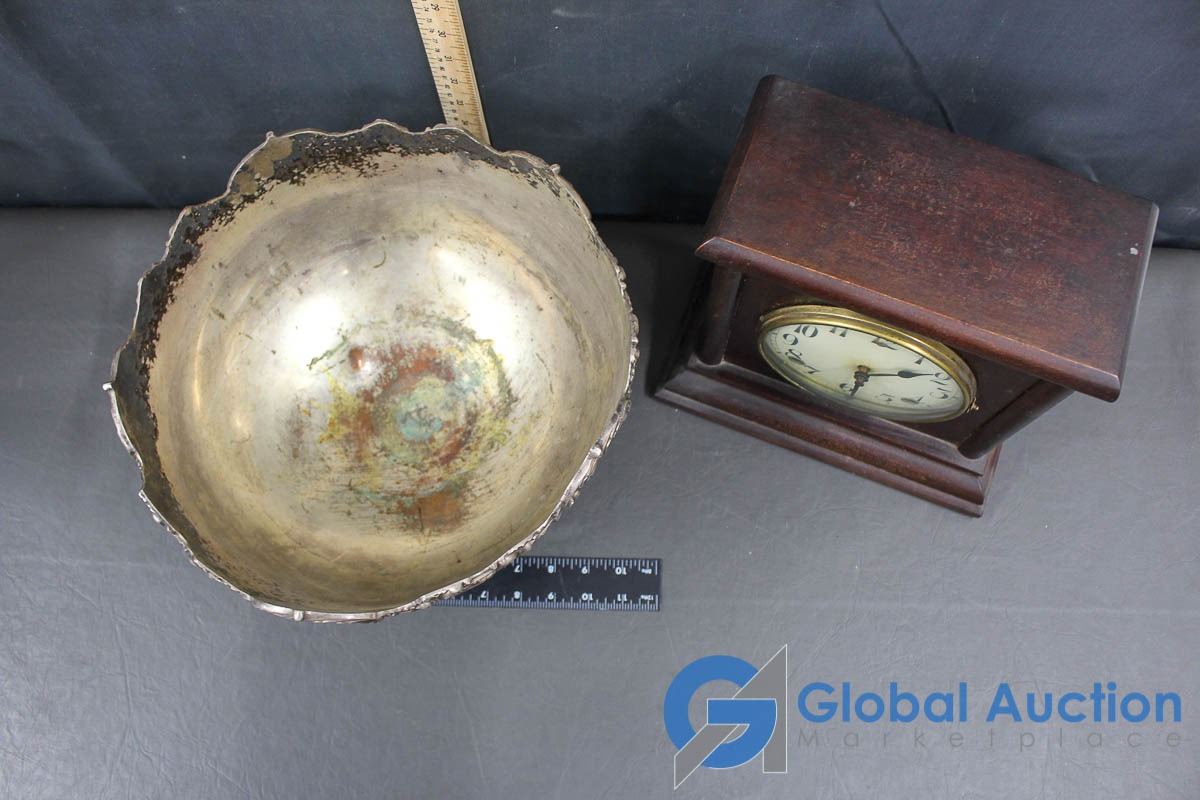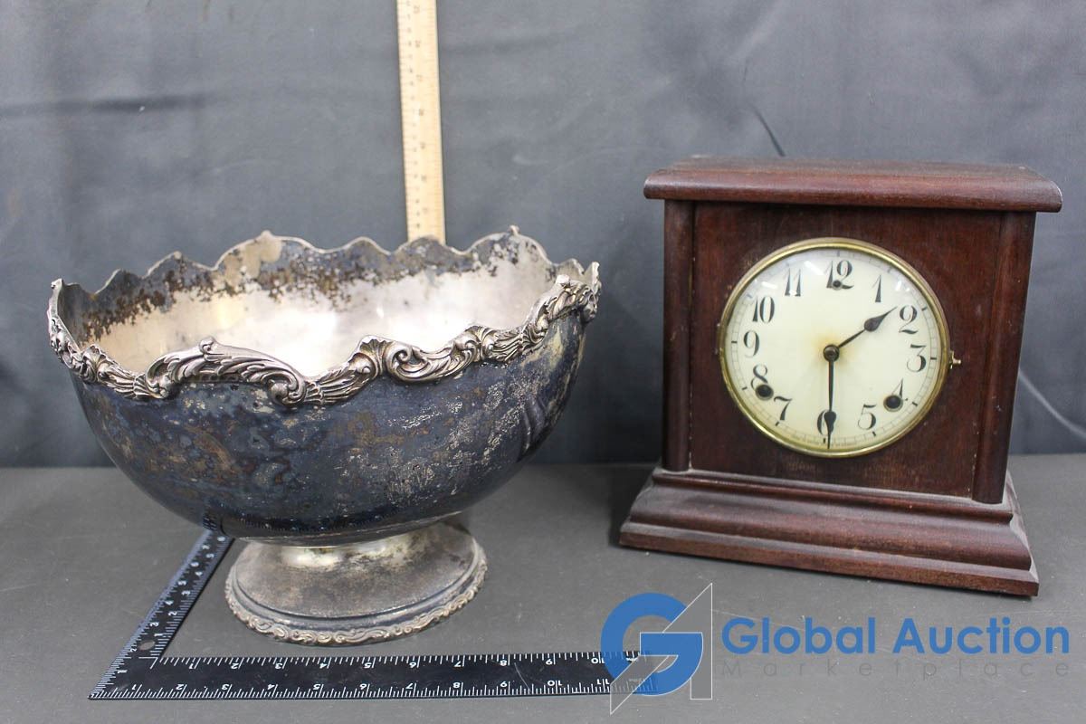 Silver Look Bowl & Wooden Mantel Clock