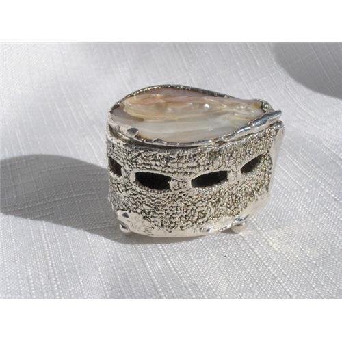 Silver Art Nouveau Mother of Pearl Box. This is a very wonderful quaint small .999 Silver box with a mother of pearl lid. The box is free formed, pear shaped and has four silver ball feet on the bottom. The inside is lined with green felt. The bottom is marked "C&R .999" Condition is excellent. This is a very special piece. Great gift idea. See photos. Take a look at my other items. Thank you for viewing.