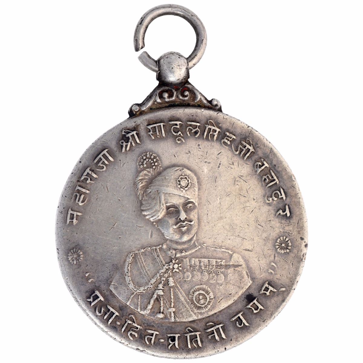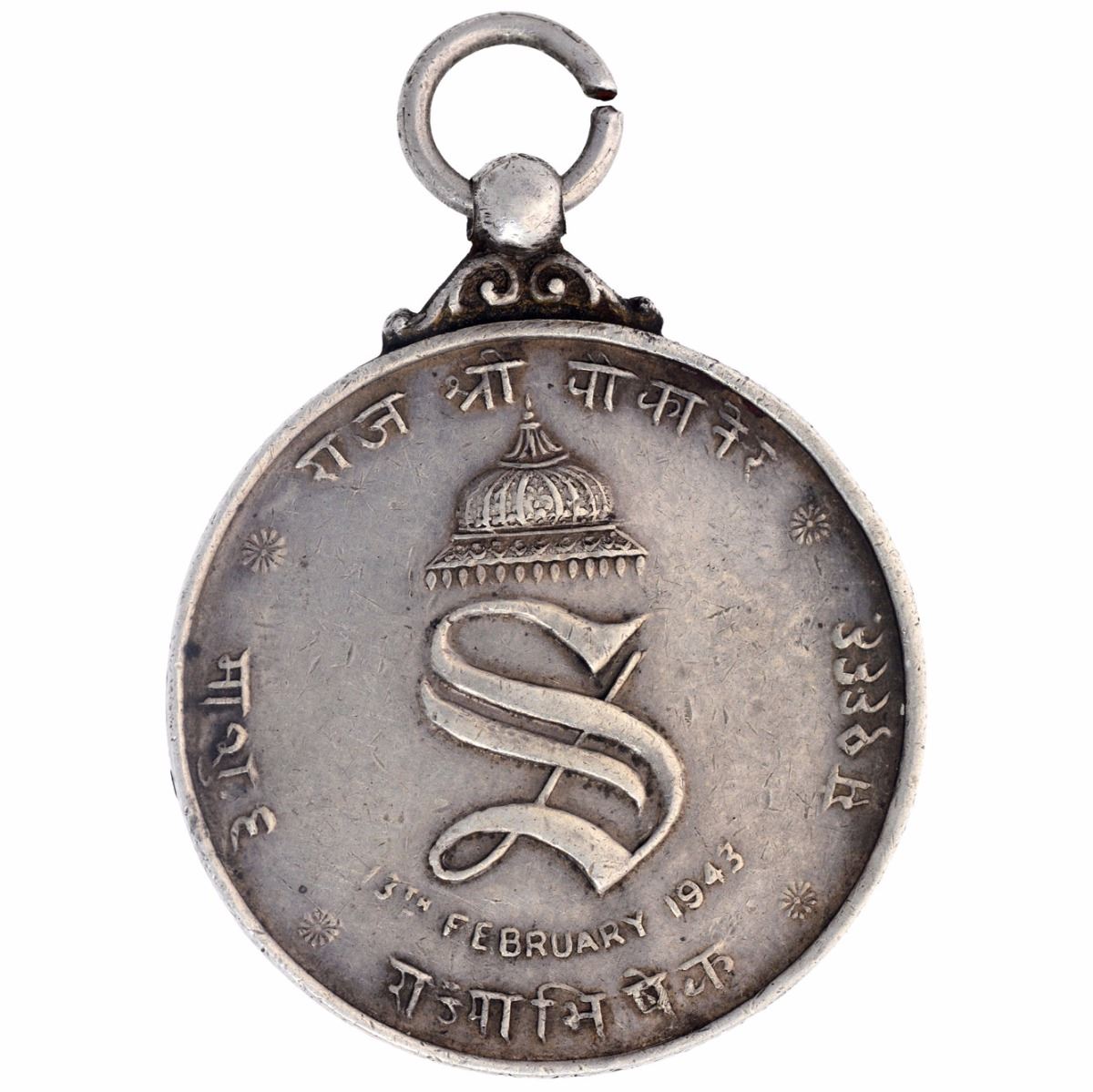 Bikaner, Sadul Singh, SilverAccession Medal (2nd issue), Obv: sadul singh in military uniform, on top devanagiri legend, below sanskrit inscription, Rev: royal cypher surmounted by the chhatar, date in english, devanagiri inscriptionon top,19.1g, 32.80mm, (Tony McClenaghan # 96), about very fine with hook.