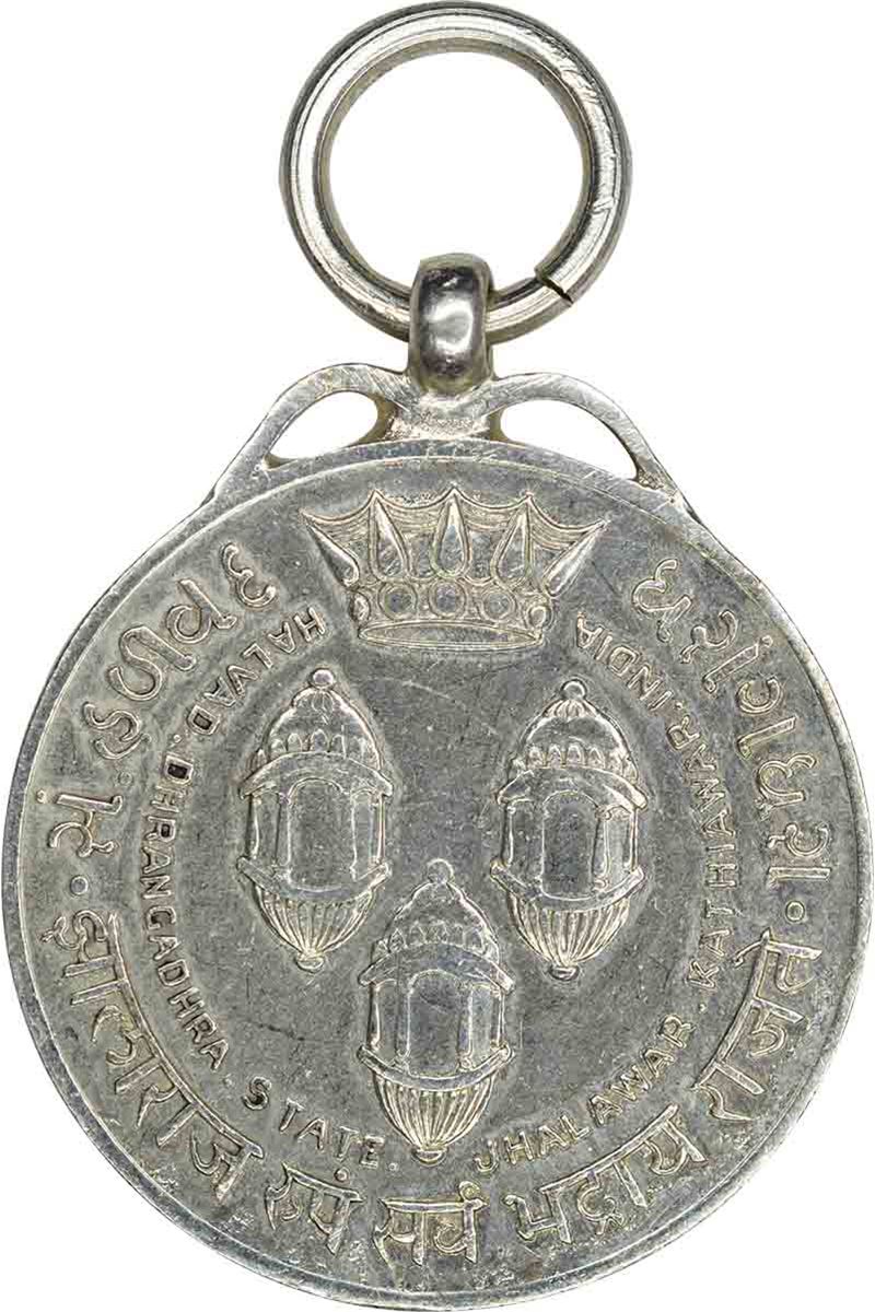 Medal, Dhrangadhra, Silver, 9 Aug 1947, Obv: ashoka chakra with the diadem above and date below, with the