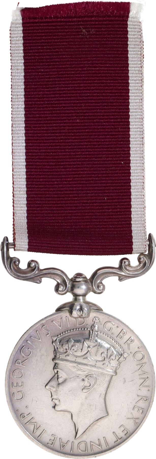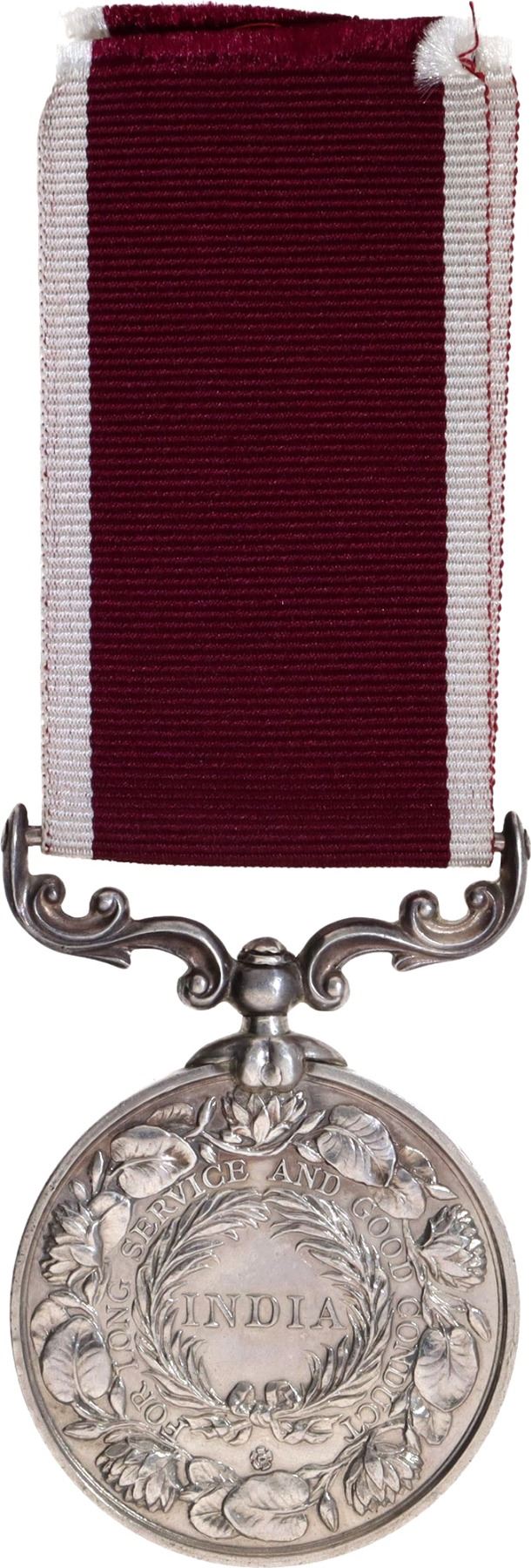 British India, Indian Army Long Service and Good Conduct (1938-47), King George VI, Silver, Awarded to “Ghulam Akbar", Obv: King George VI facing left, legend around "GEORGIVS VI D. G: BR: OMN: REX ET INDIAE IMP:", Rev: the word 'INDIA' set within a palm wreath, legend "FOR LONG SERVICE AND GOOD CONDUCT" surrounded by the border of lotus, engraved on the edge "GSS-6962 NK. GHULAM AKBAR, RECTS REC CAMP", along with a bar and maroon with white color stripe, 38.57g, 35.87mm, (MYB. 2007 # 244), toned, about extremely fine, Rare.