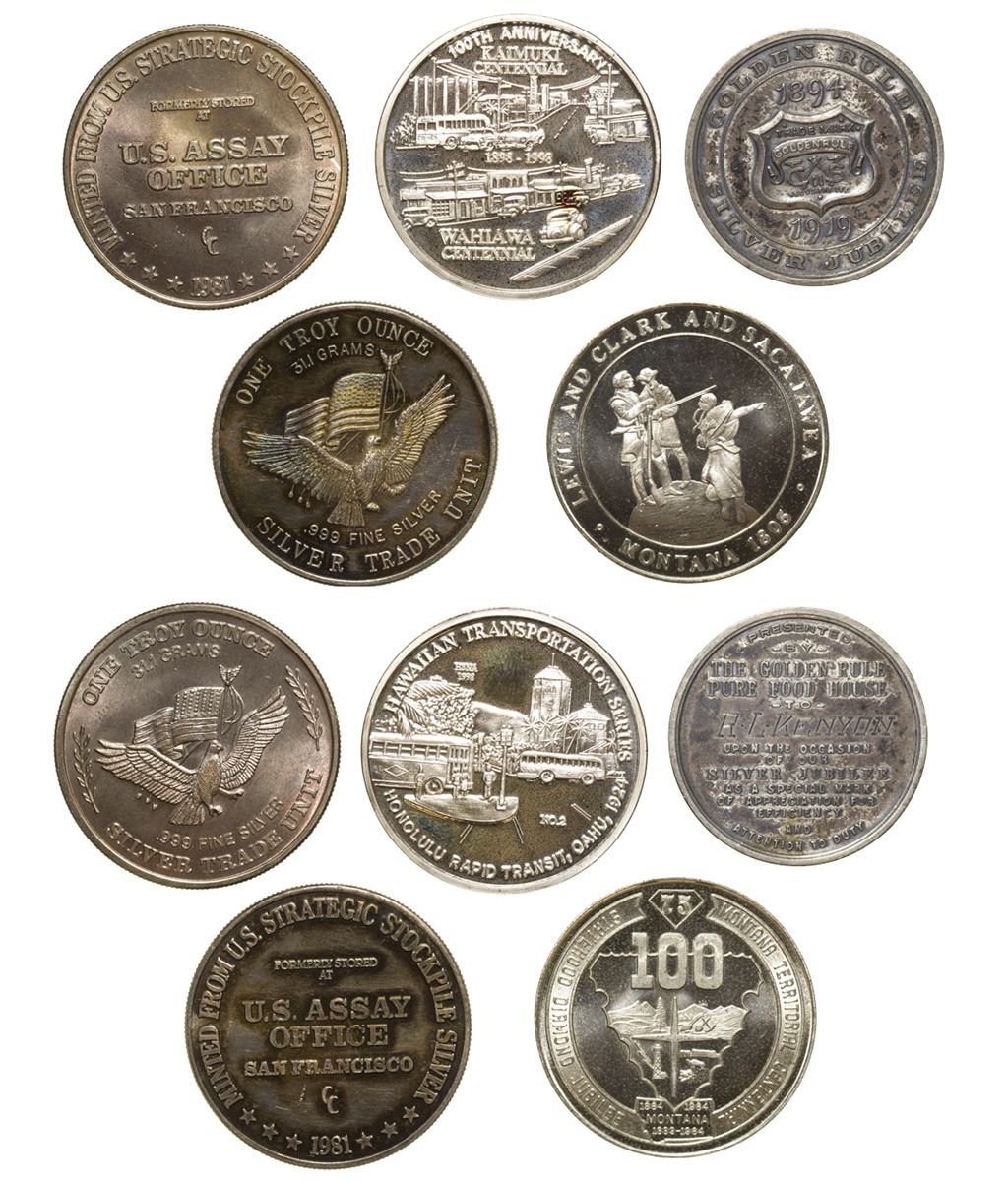 Lot of 5. 1) Golden Rule, Silver Jubilee. 1894-1919. EF. 35mm. 2) Lewis and Clark and Sacajawea. MT 1805. UNC. 40mm. 3) Hawaiian Transportation. Honolulu. .900 silver. 4) and 5) 1981 U.S. Assay Office San Francisco. 40mm. 999 silver. 1 troy oz.