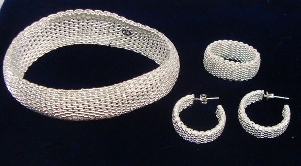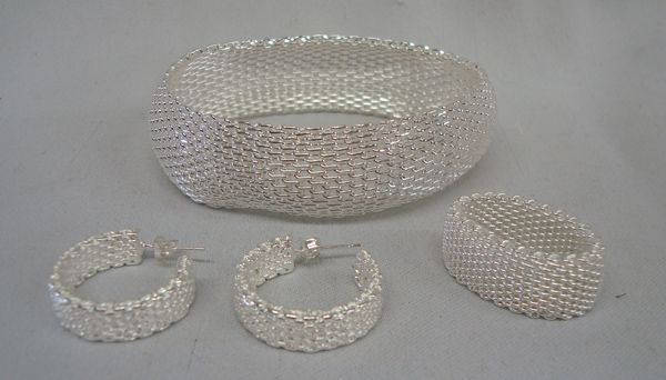 Silver Mesh Jewelry Set, Earrings, Ring, Bracelet. Sterling Mesh Bracelet approx 8'', is a slip on. Ring is size 9; Pierced earrings are 1''H x .25''W. Lovely and ready for the party.