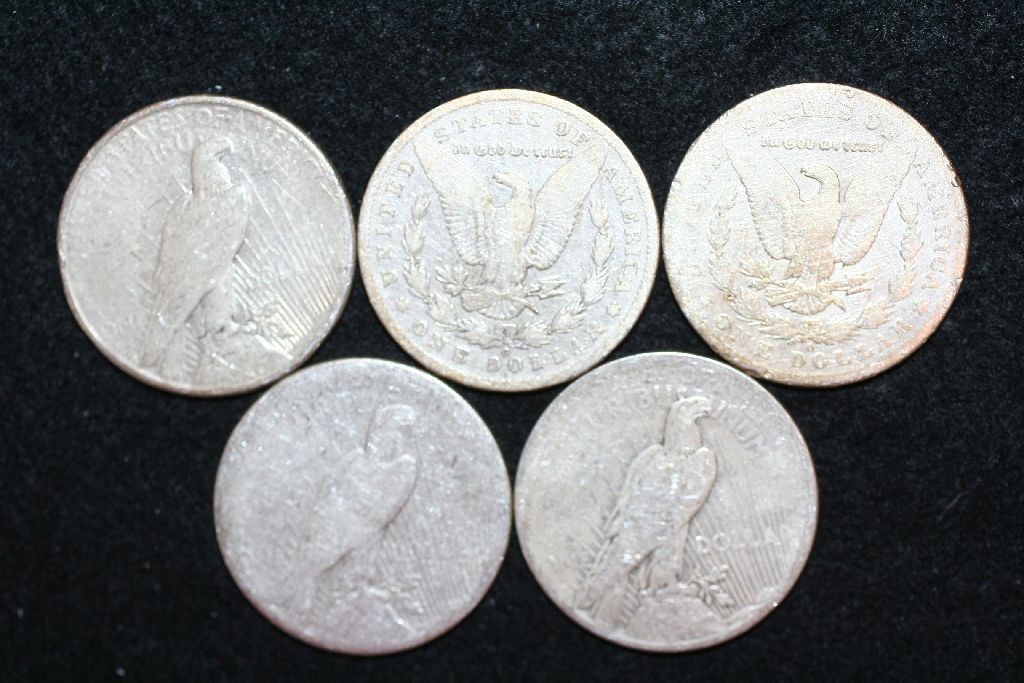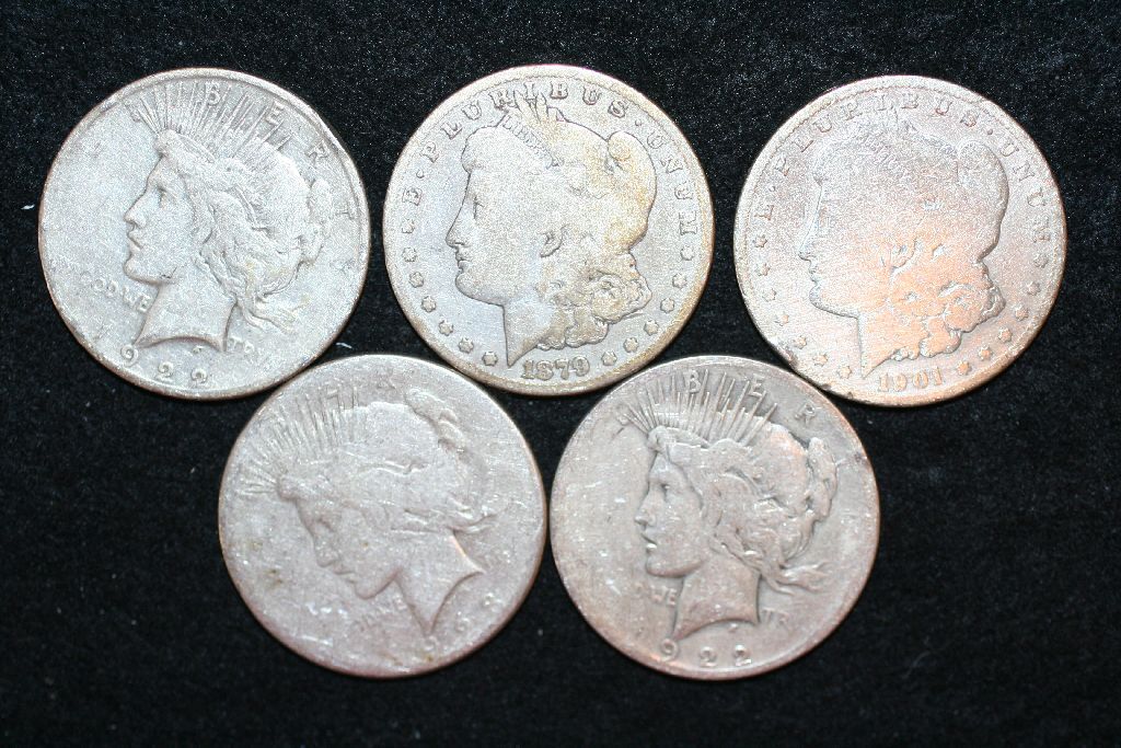 Silver Morgan $1 & Peace $1, Various Dates, Low Grade, Lot of 5
