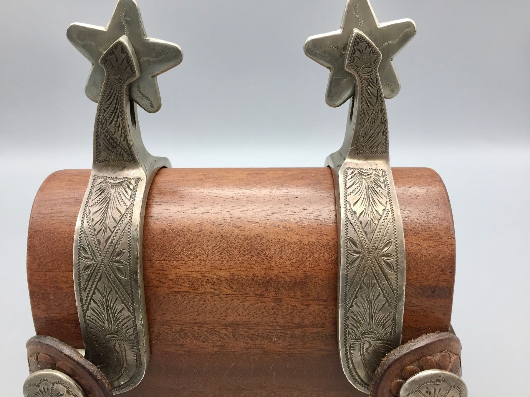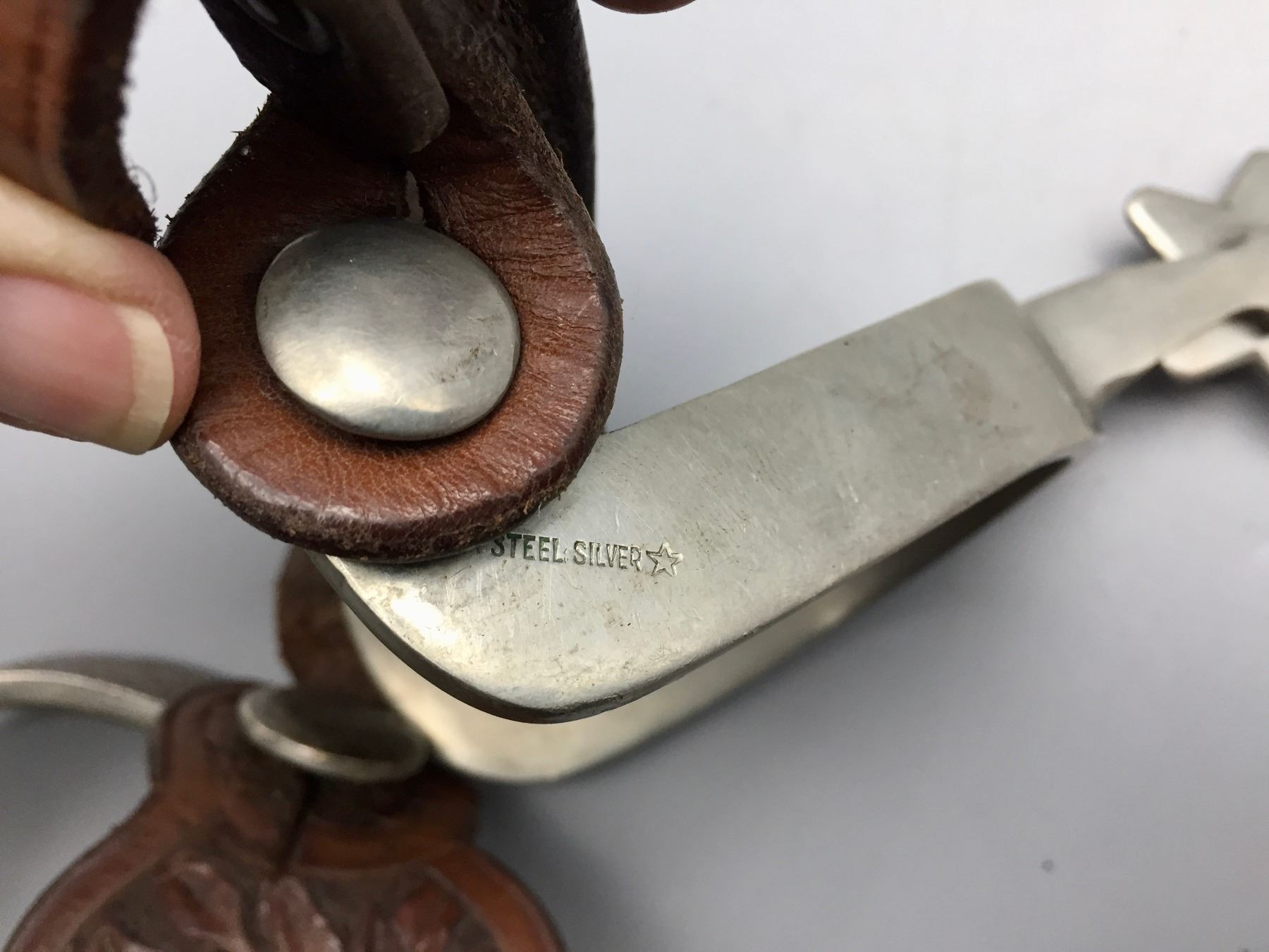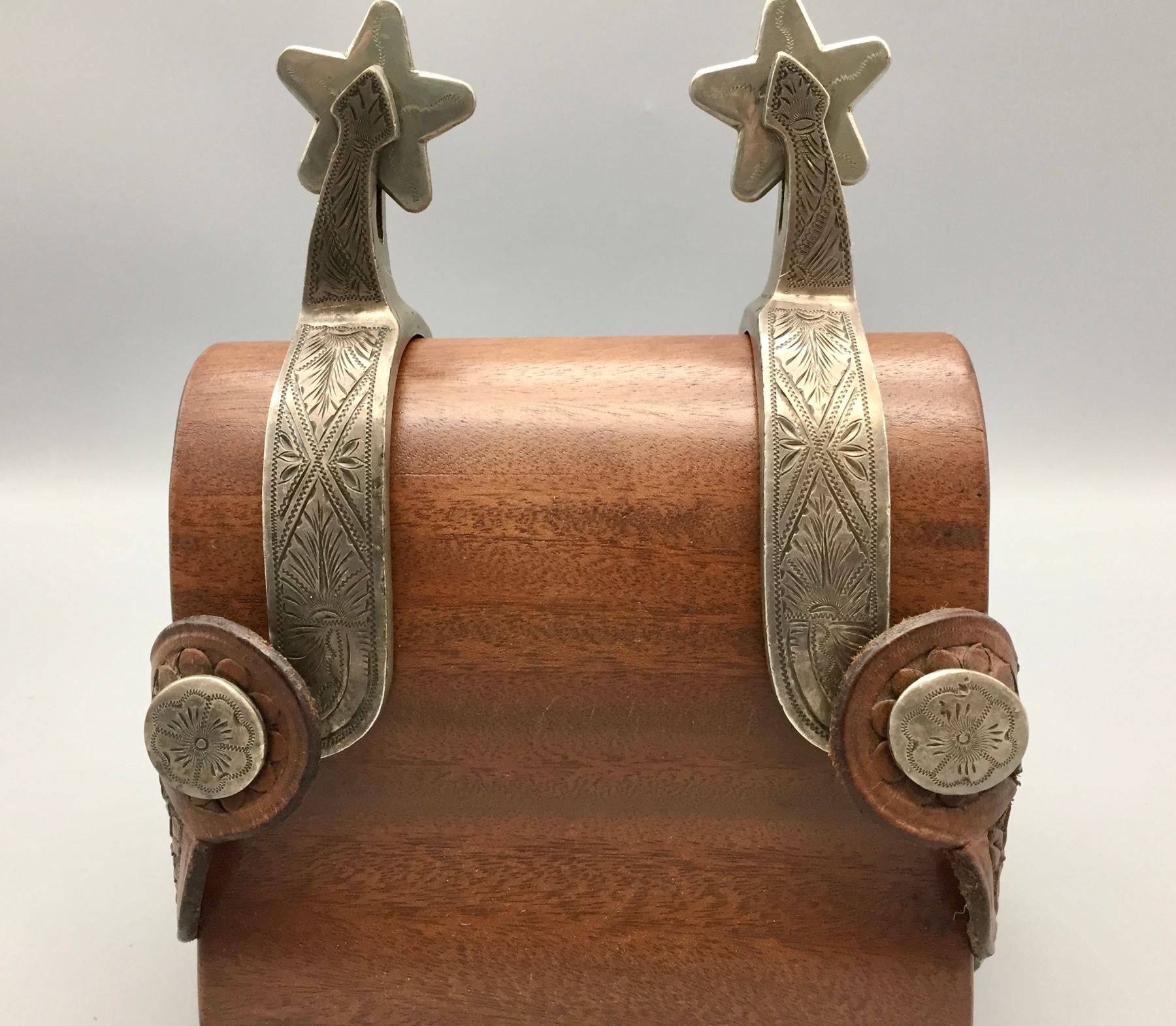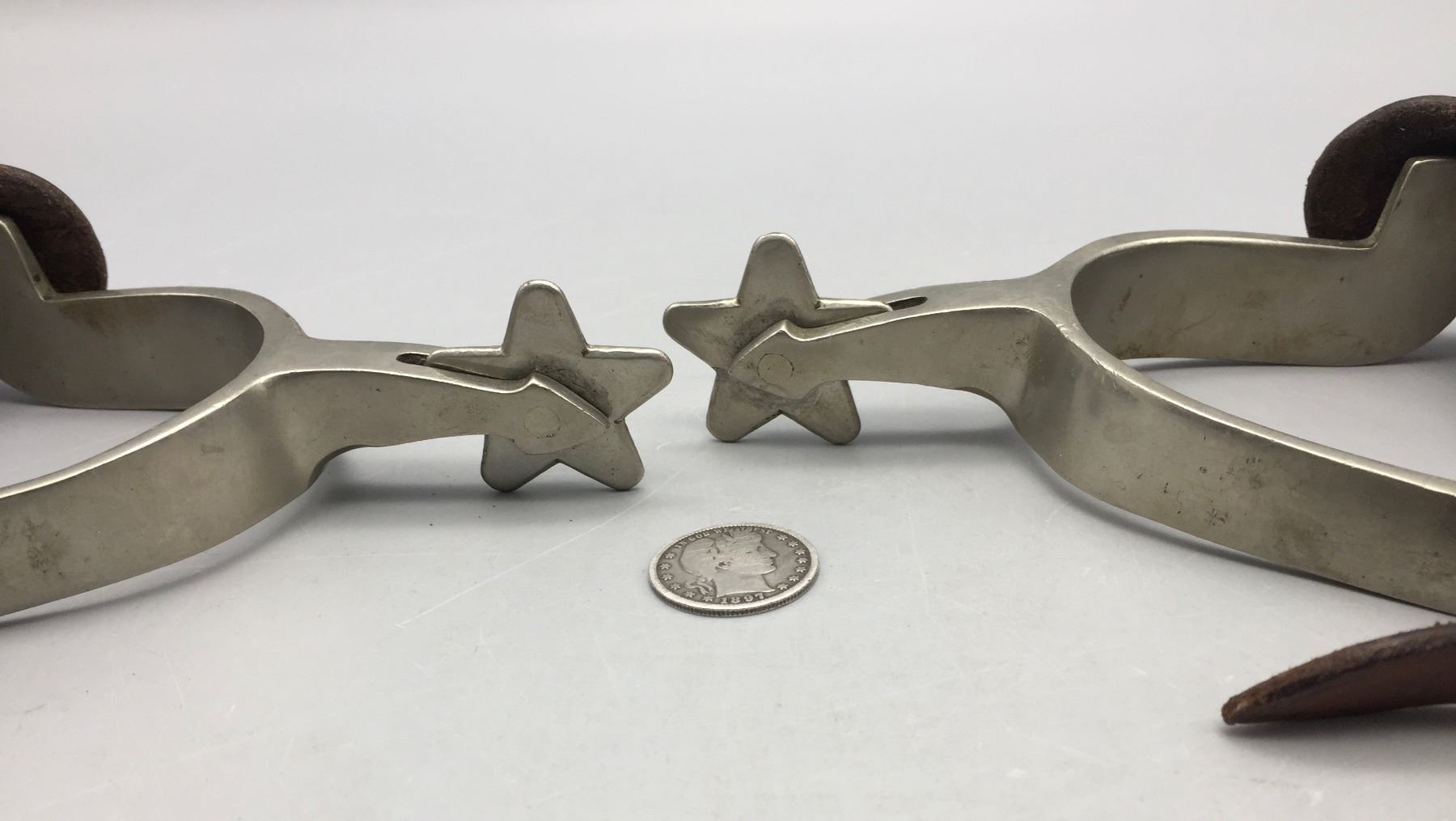 Description: Featured in this lot is a pair of silver mounted Buermann Spurs with brown leather straps and star shaped rowels.