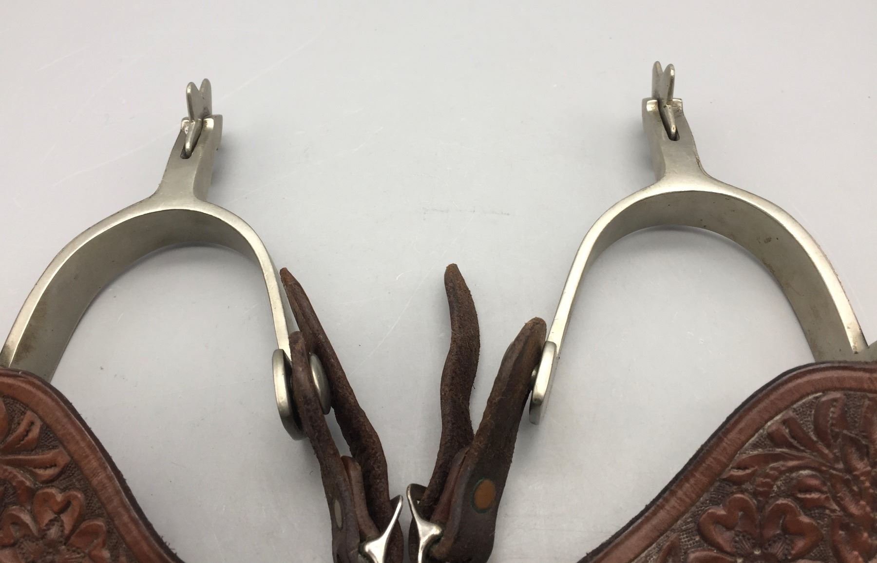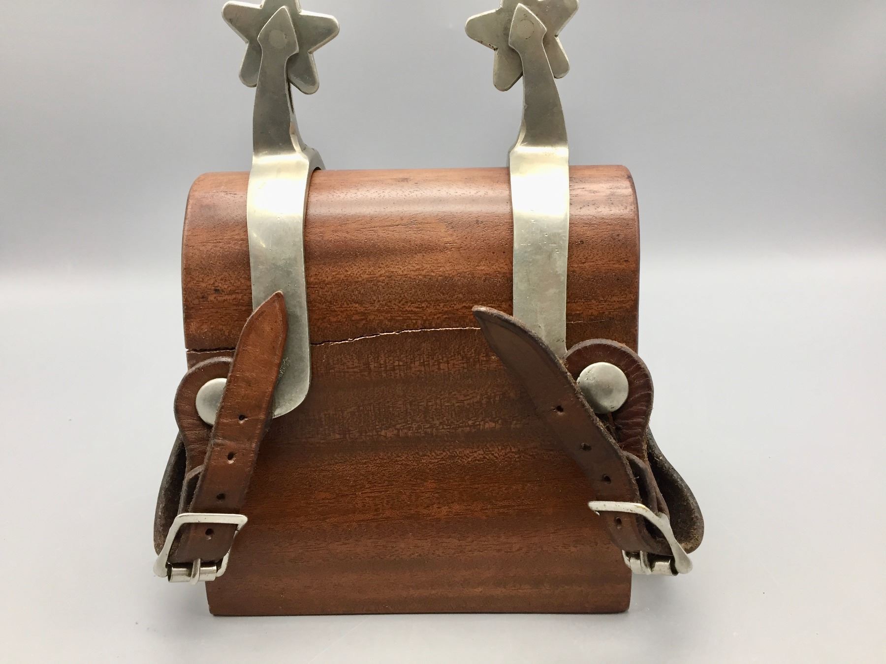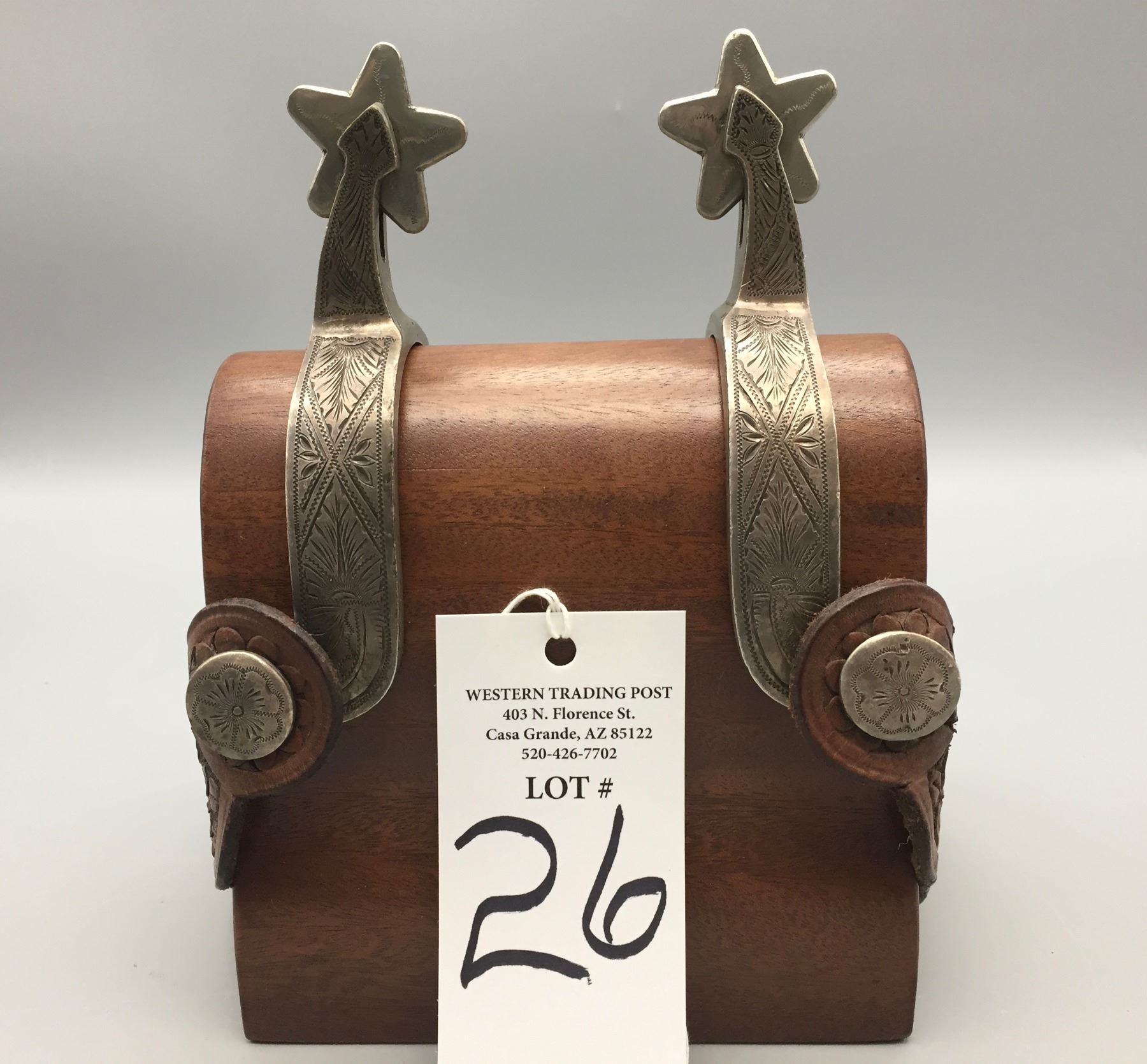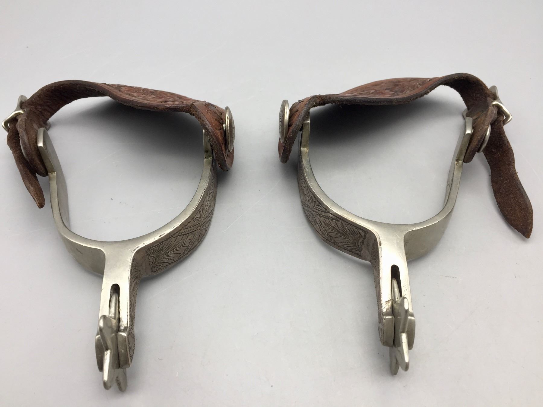 Description: Featured in this lot is a pair of silver mounted Buermann Spurs with brown leather straps and star shaped rowels.