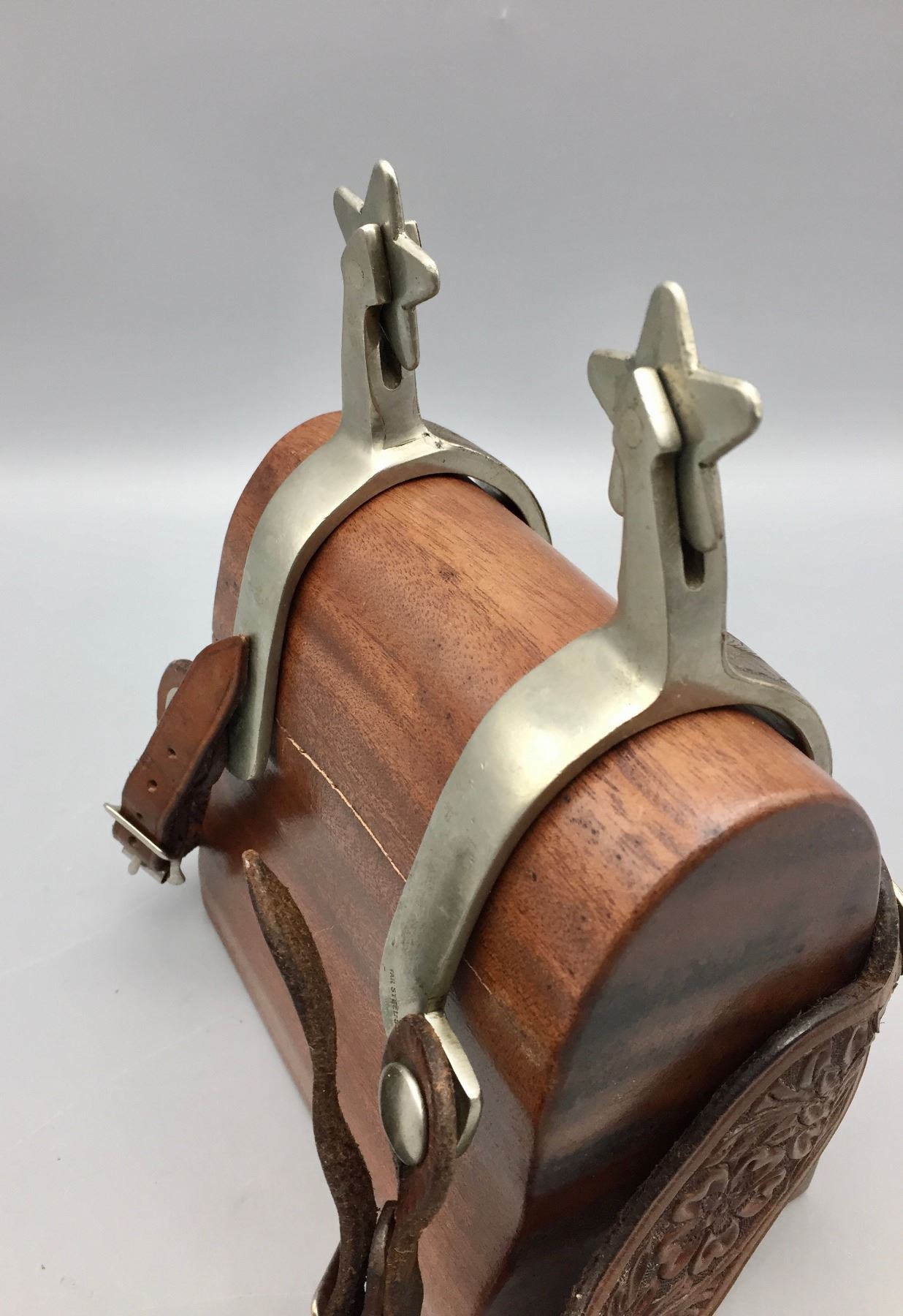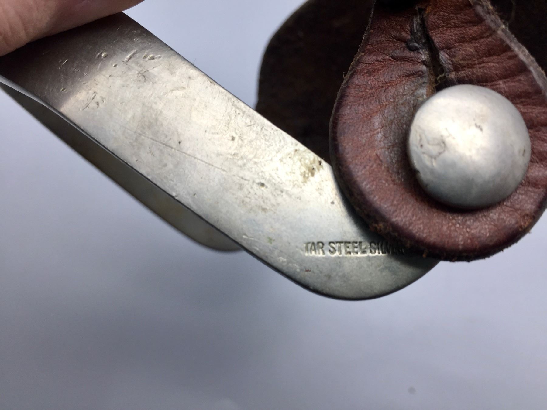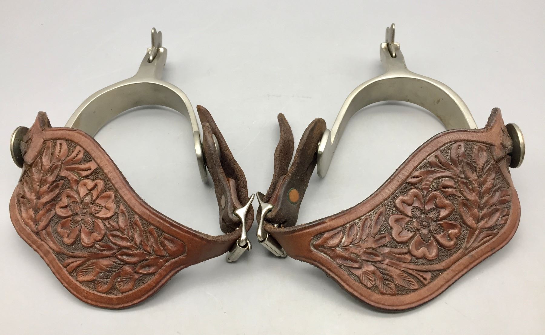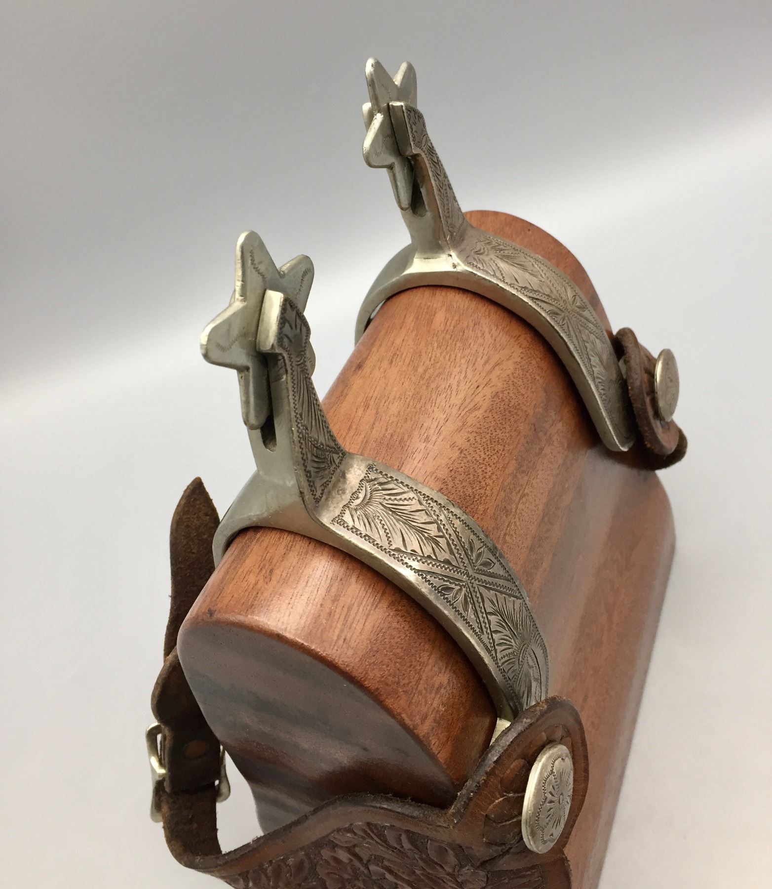 Description: Featured in this lot is a pair of silver mounted Buermann Spurs with brown leather straps and star shaped rowels.