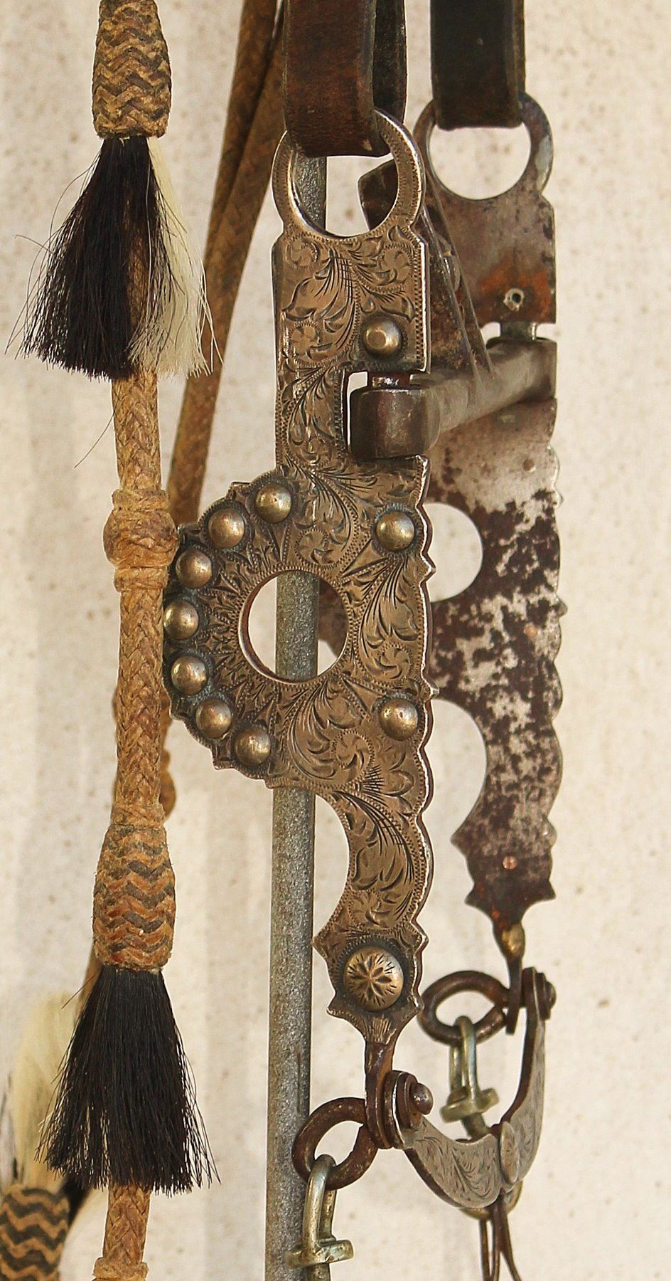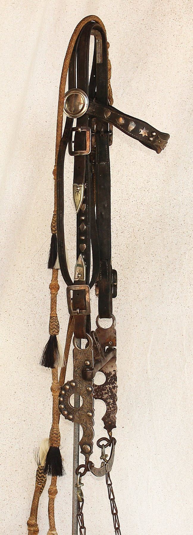 A great looking fully flower tooled one ear bridle with engraved silver card suites and wonderful Hamley & Co. marked silver inlaid bit and braided rawhide romel reins.