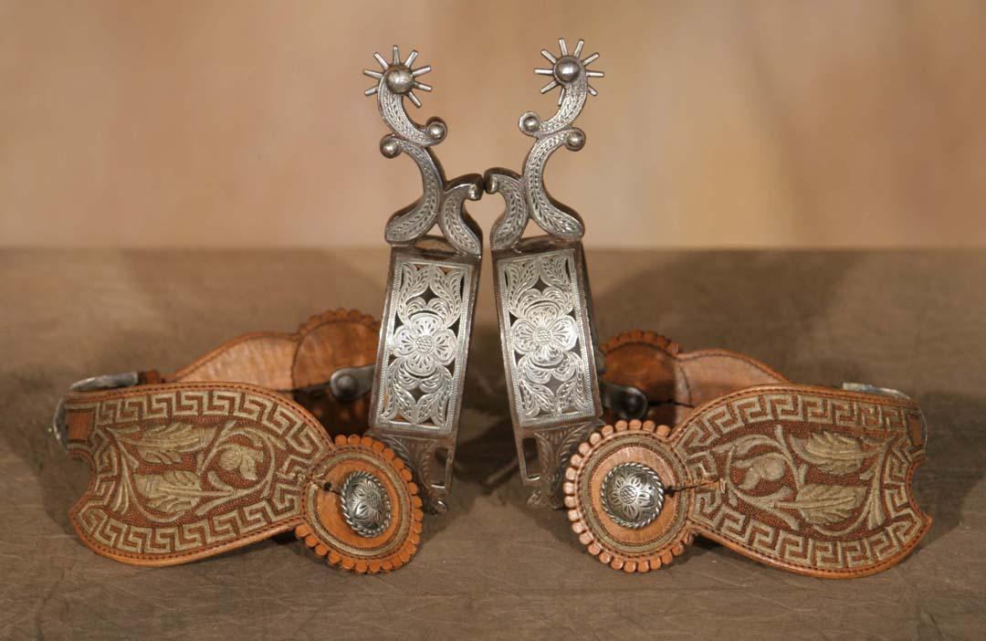 Silver Mounted Mexican Spurs. Curved shanks, piteado straps, 1 1/8" ten point rowels. Fine work. Early-mid 20th century. (est $800-1,200). For condition reports please visit: www.auctioninsantafe.com/cr2011.pdf