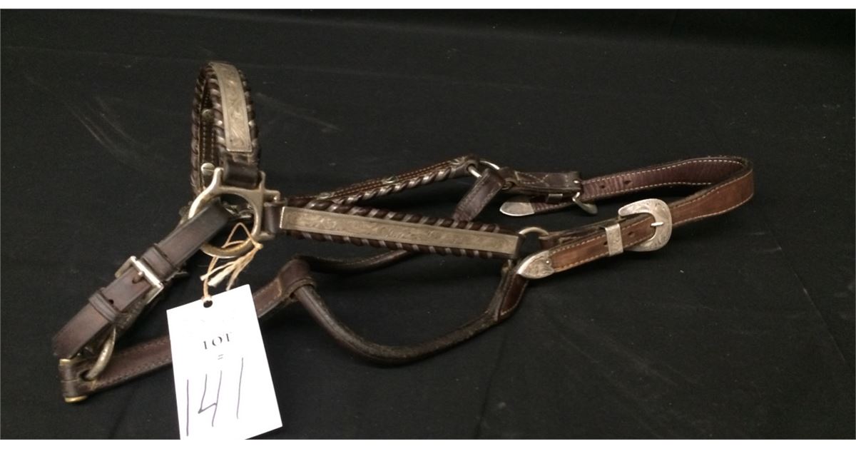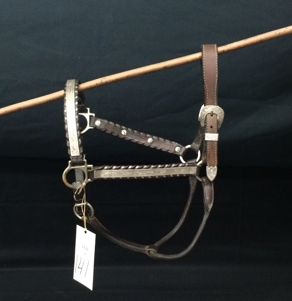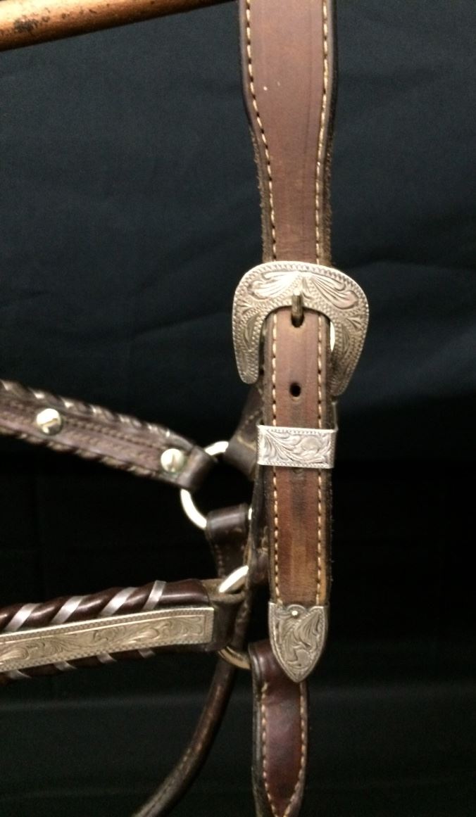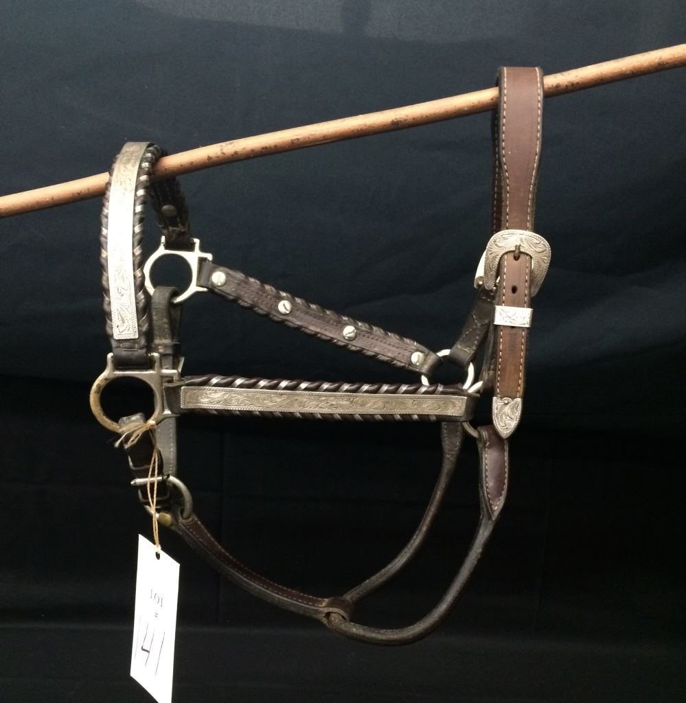 This vintage show halter is by Broken Horn. According to their website, Broken Horn halters are embellished with sterling silver overlay accents, hand engraved on our premises. Fits a medium to large size horse. Good condition. Shipping: There will be a $5 handling / packaging fee for shipping this lot. The actual cost of postage will be added on top of that.