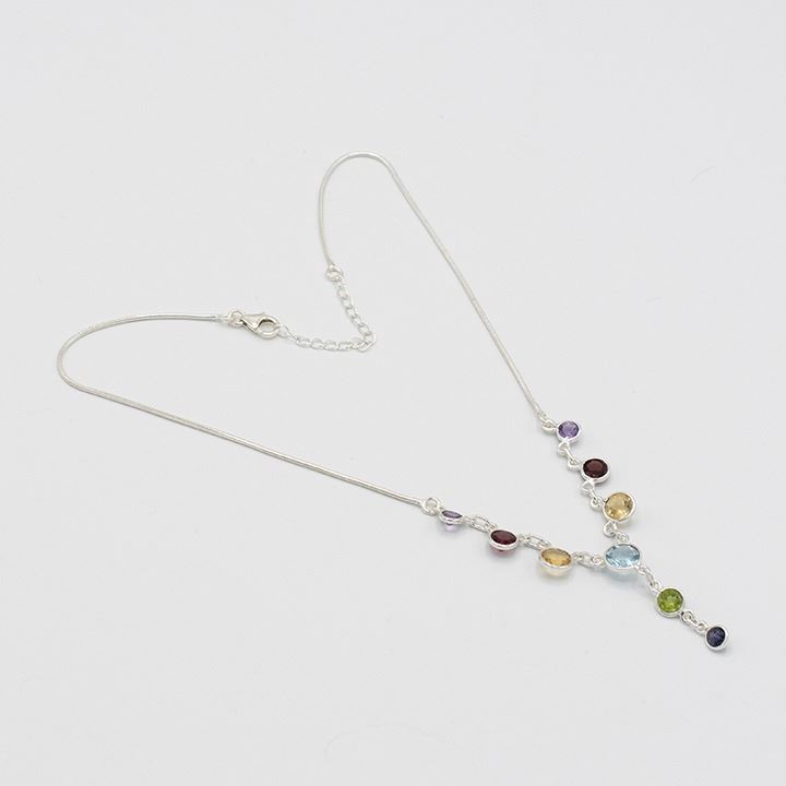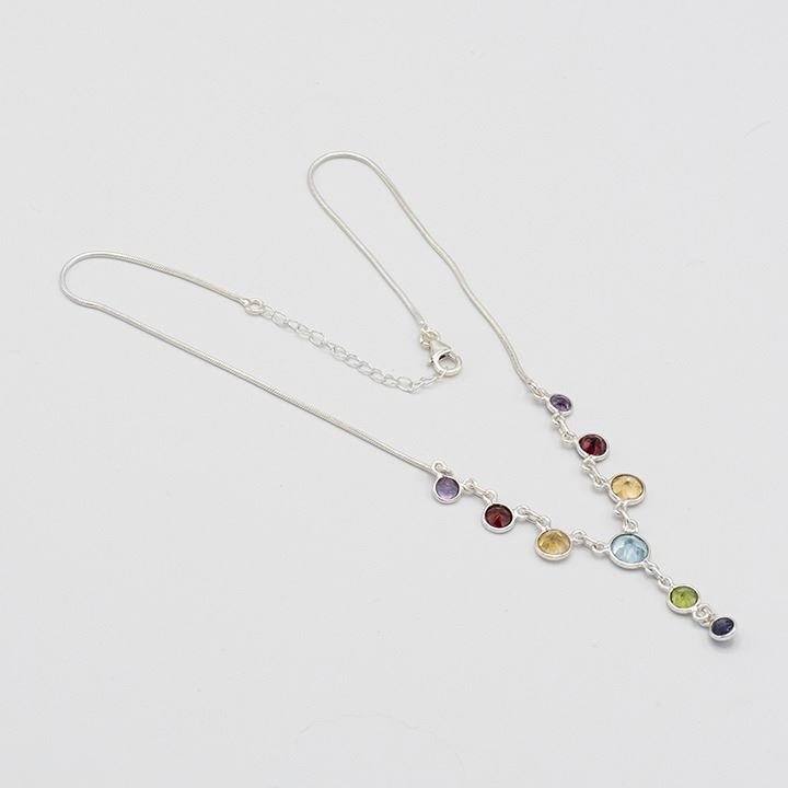 Silver Natural Mixed Gemstone Necklace. Mounted in solid .925 sterling silver. This natural gemstone necklace includes 8.5 cttw of amethyst, citrine, peridot, garnet and a sky blue topaz center stone. The total length is 18 ". Total eight is 9 grams.