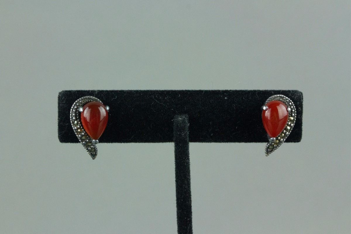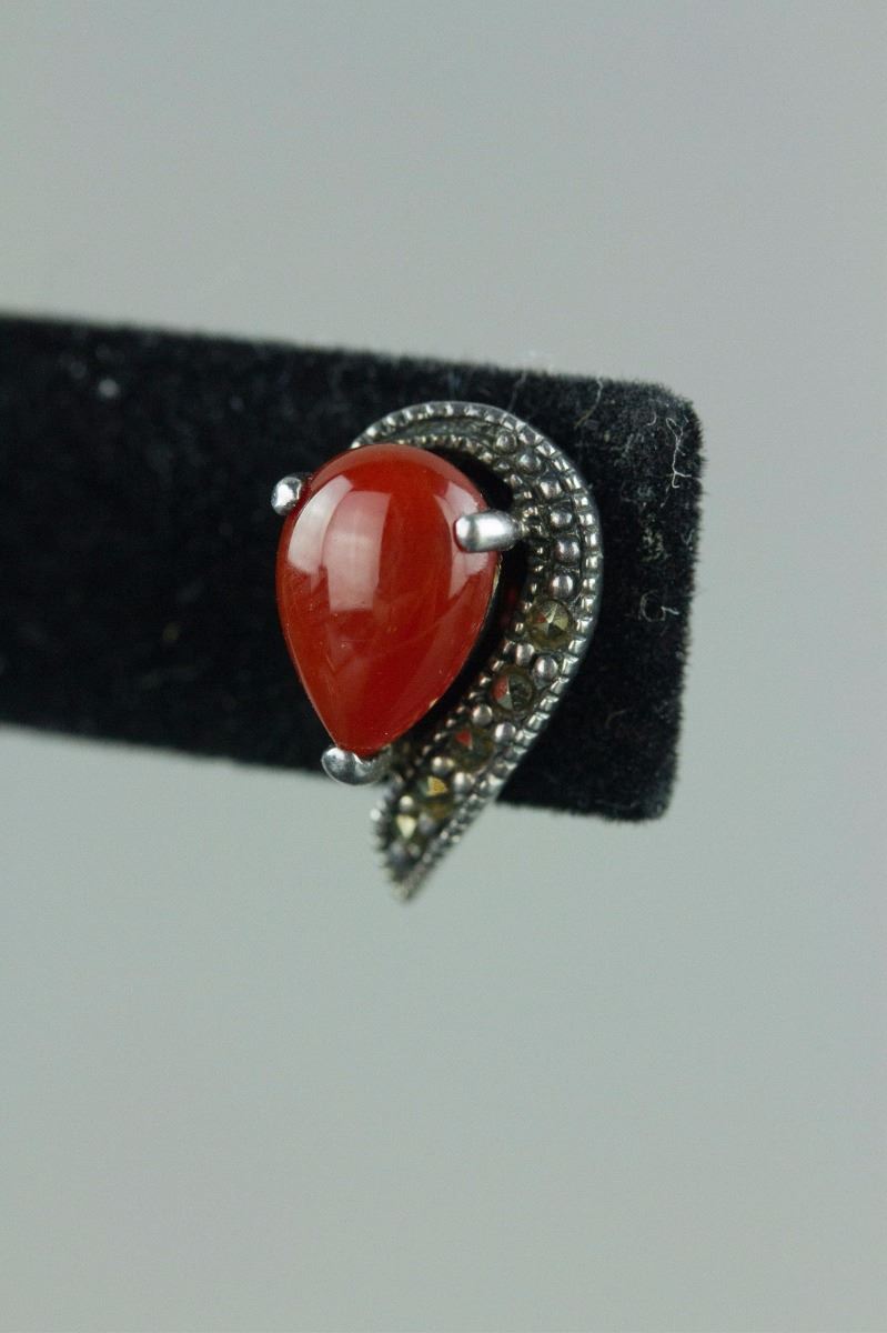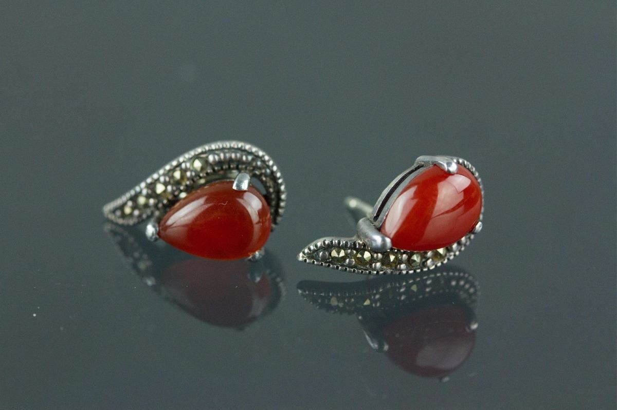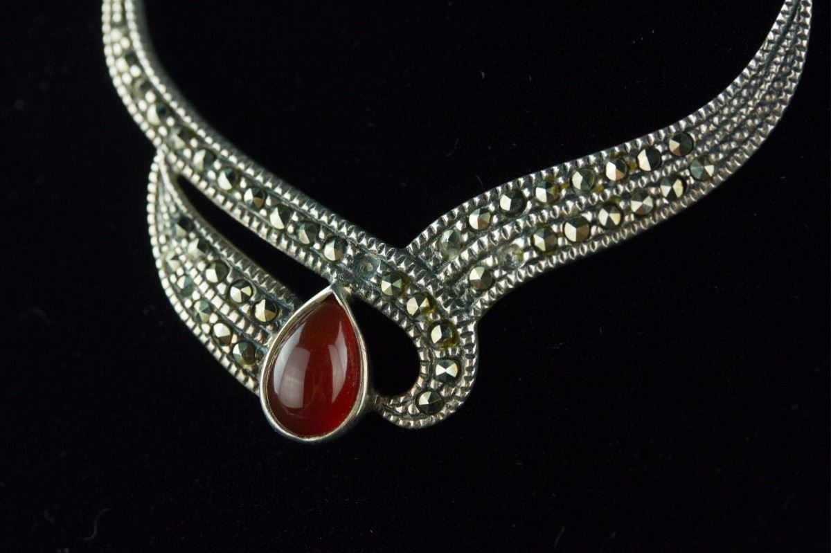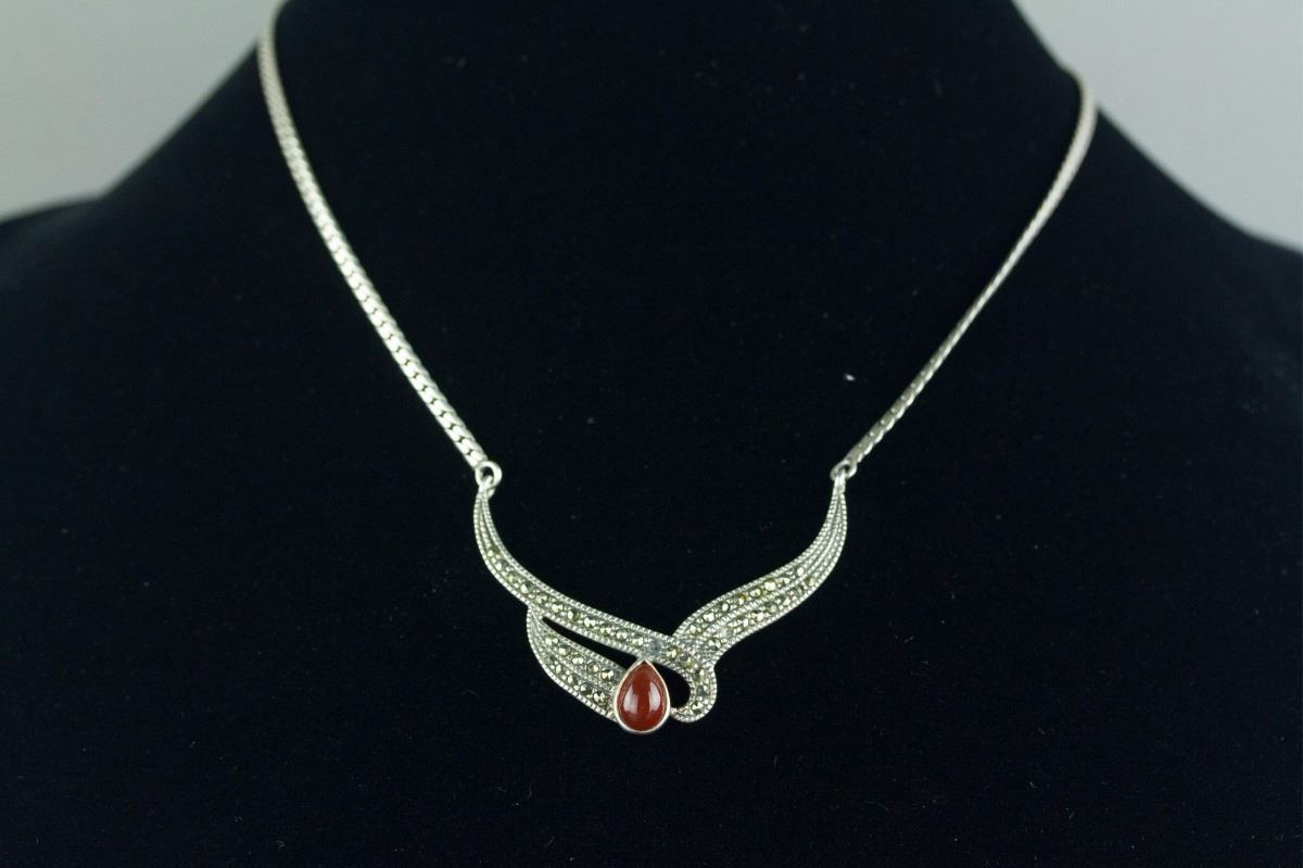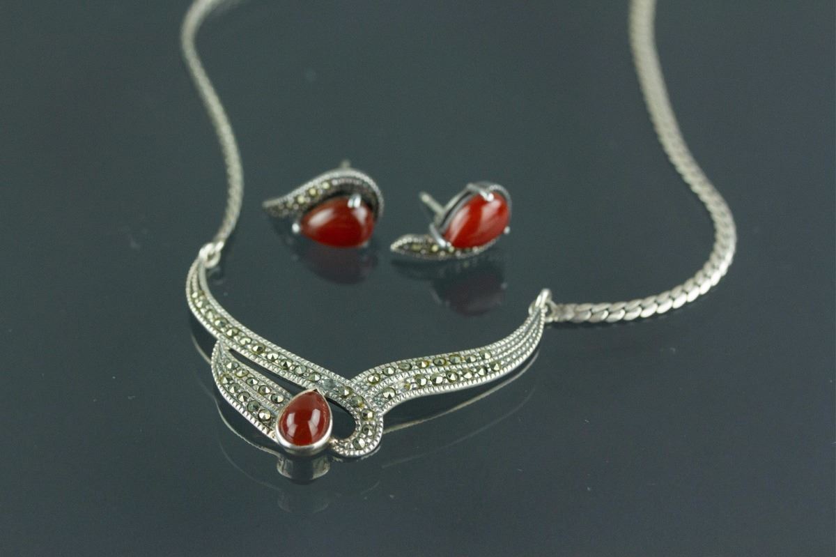 Set of silver necklace and a pair of earrings; inlaid with tear-drop-shaped agate-like gemstones; stamped with 925 silver mark on back; H: 21 cm, W: 1 cm, L: 1.5 cm, 17 grams