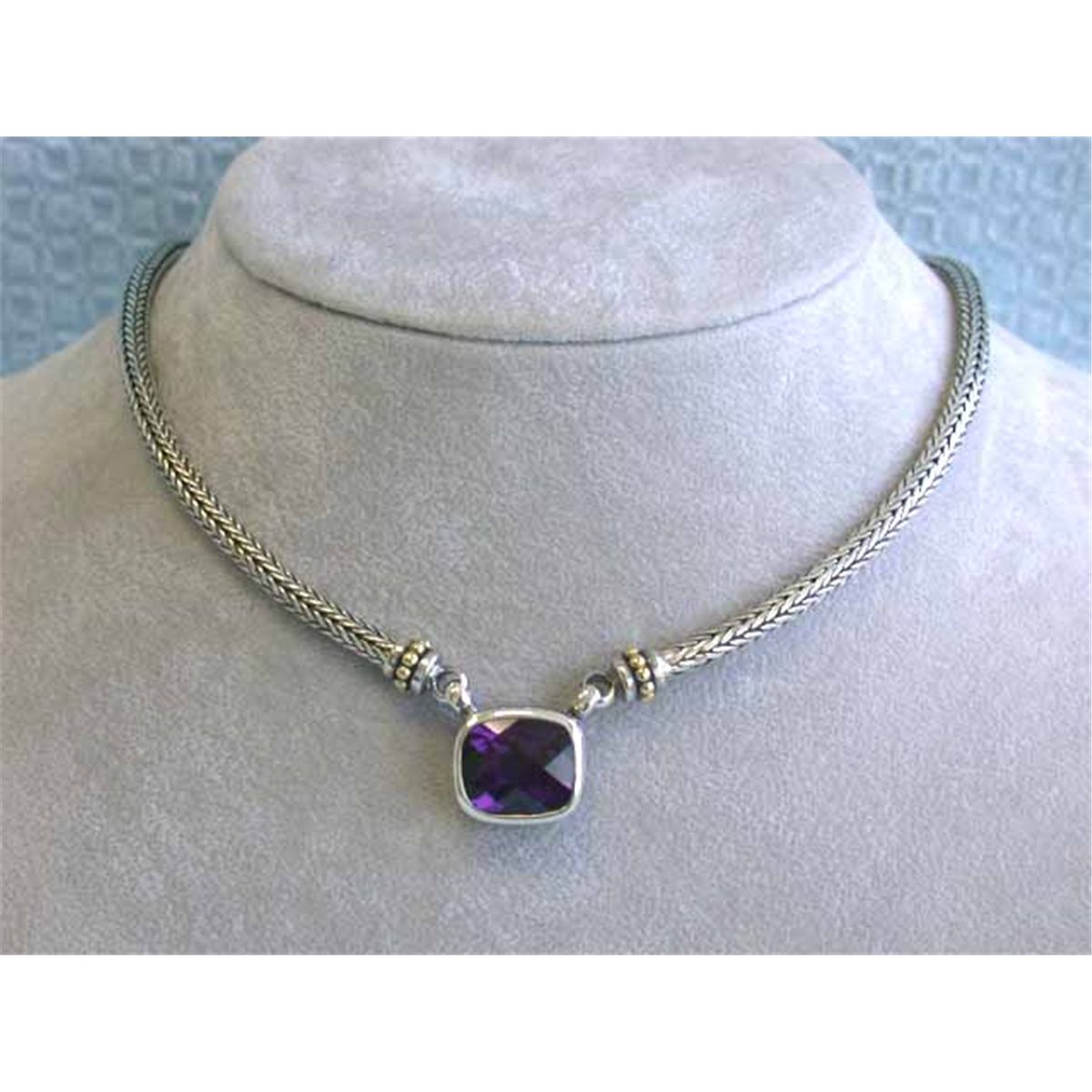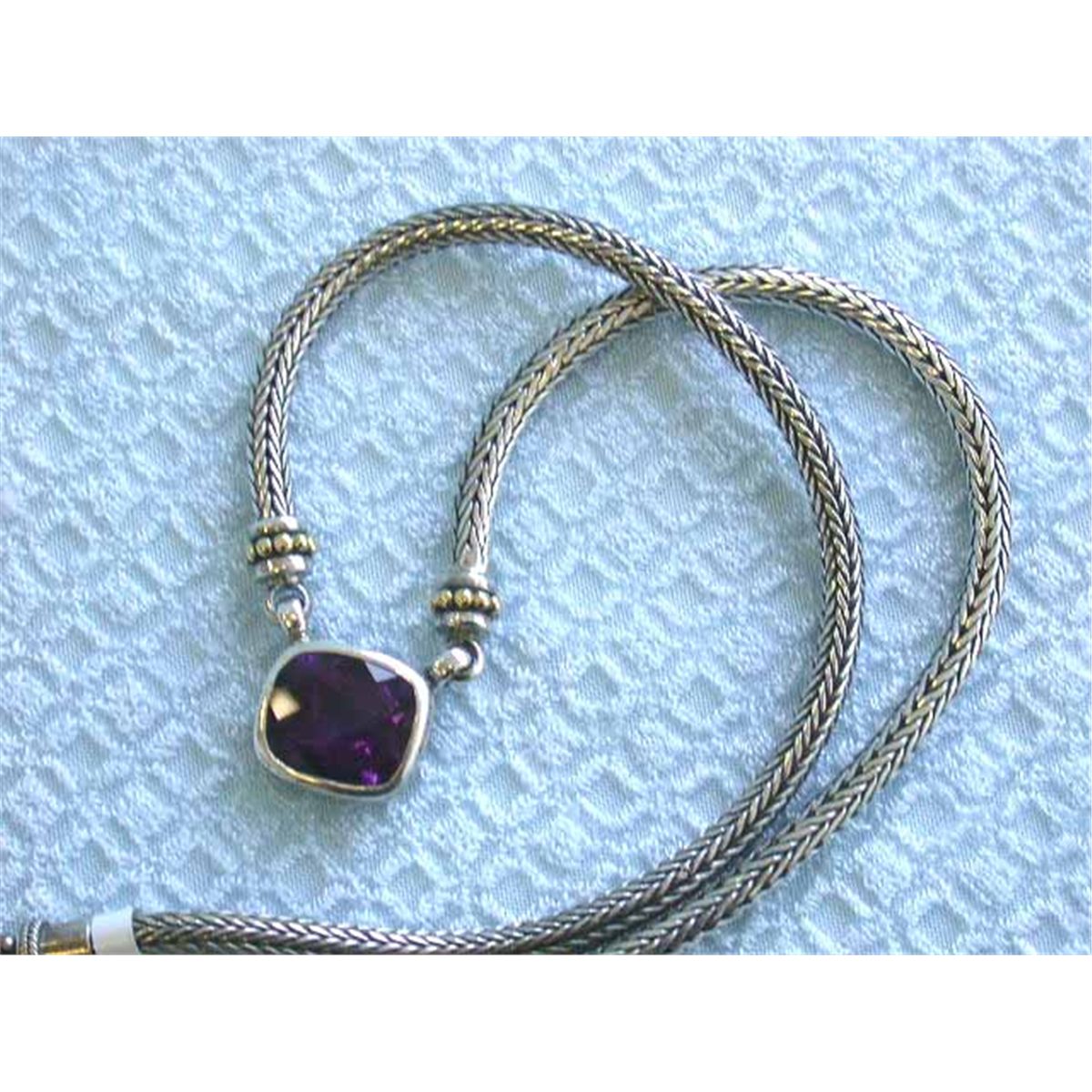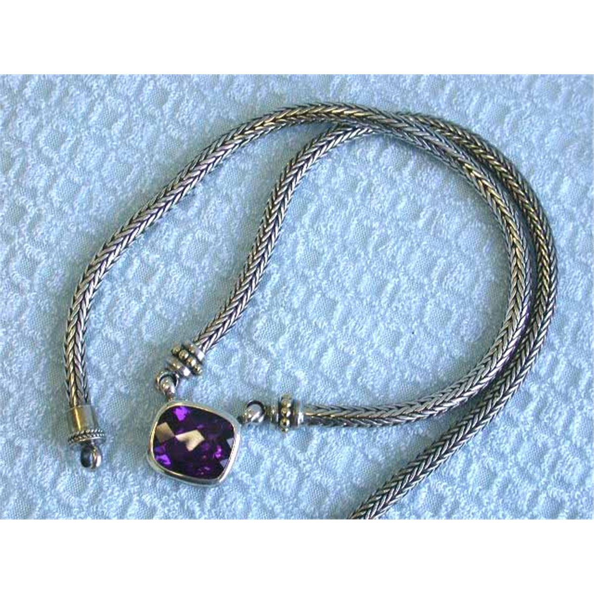 Silver Necklace. The necklace has Silver with 18k Yellow Gold accents and Amethyst - 9.15 carats. Its Length - approximately 18 inches long and Weight - 43.0 grams.