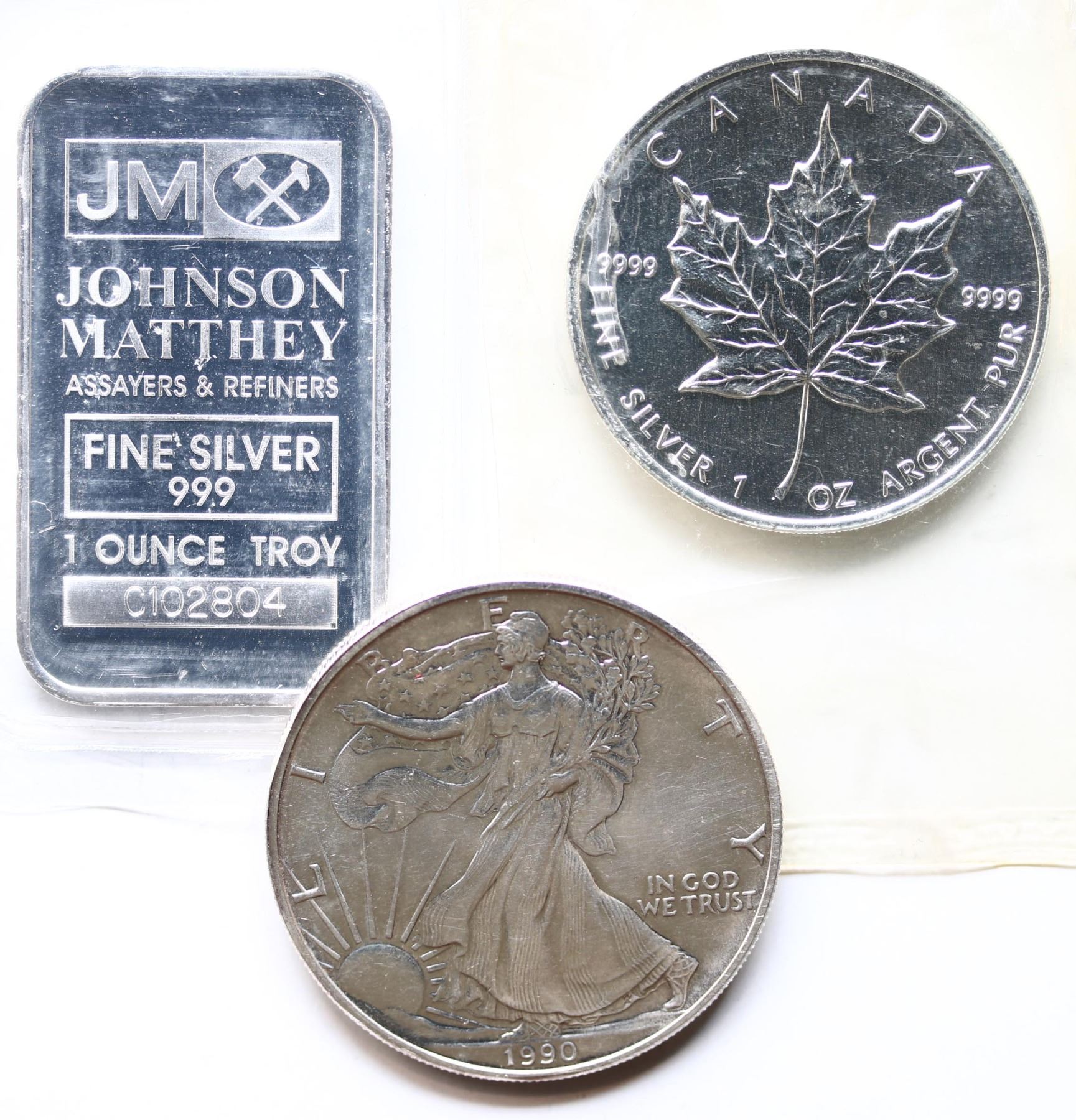 Silver OZ's - 2001 SML, US Eagle & Silver Bar JM - Lot of 3 X 1 oz .9999 Pure silver - Tax exempt