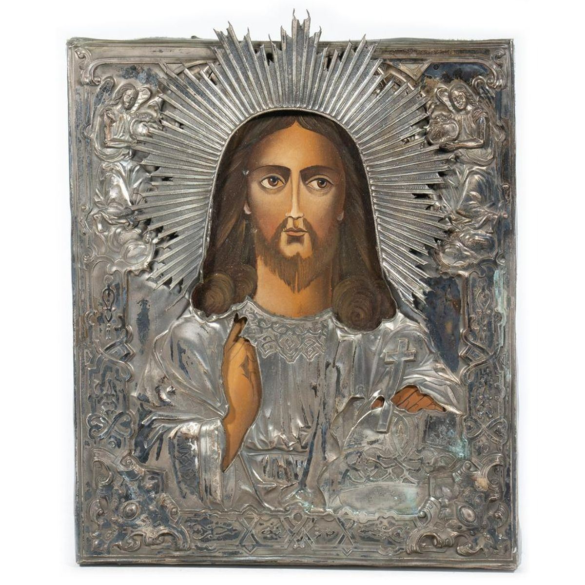 The oklad with angels at both sides of the applied halo, the figure's hair painted with large curls. 12in. x 10 1/4in. Condition: Image in very good condition (possibly repainted?); metal with tarnish and patina.