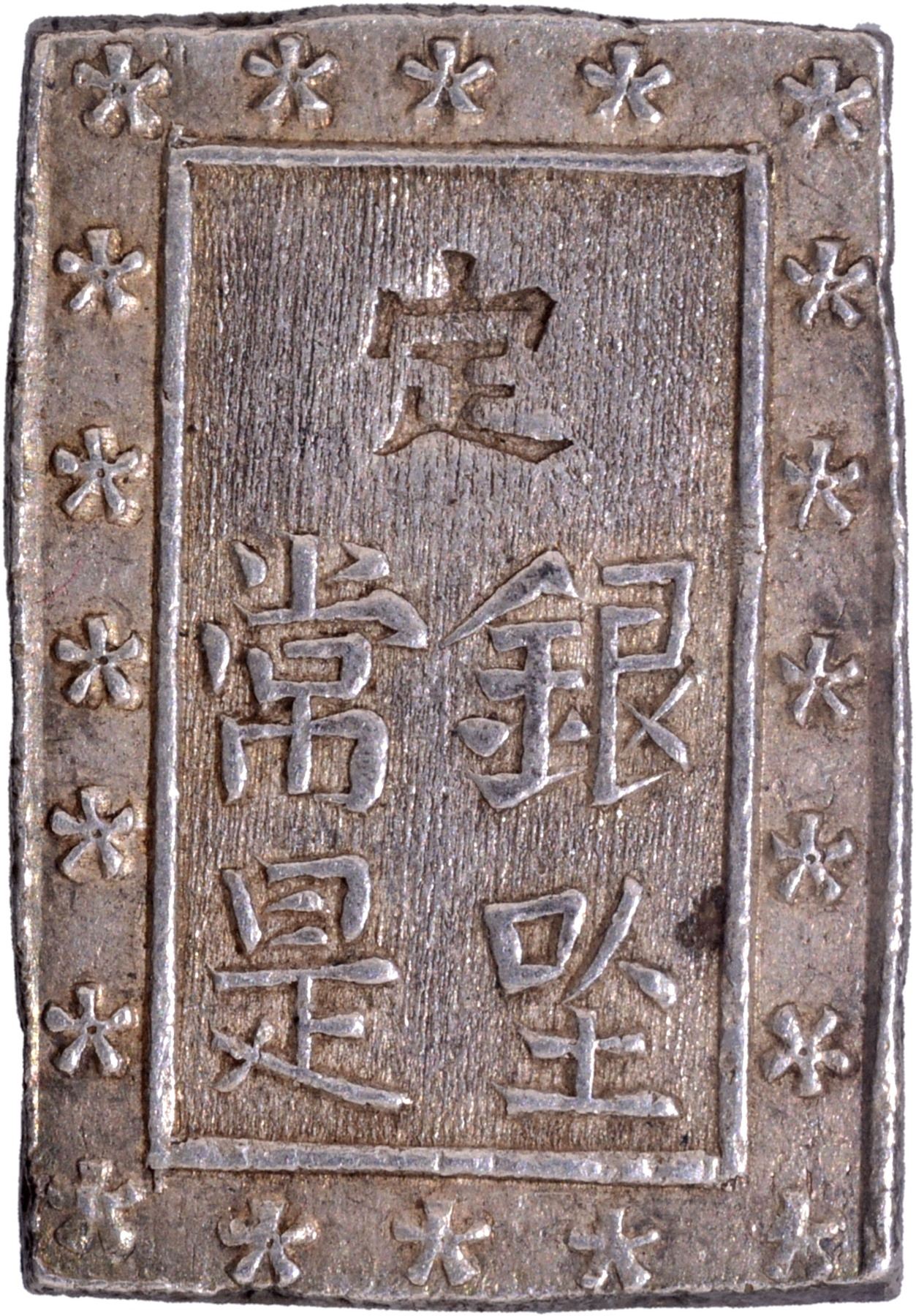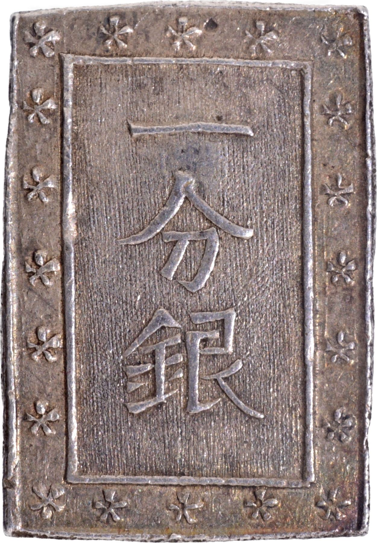 Japan, Silver 1 Bu Gin,1837-1868 AD,Obv:Incuse stamp? (= Jo) over 4 kanji in a rectangle surrounded by 30 sakuras (cherry blossoms) one of them inverted,Rev:3 vertical kanji in a rectangle surrounded by 30 sakuras (cherry blossoms) one of them inverted,8.55g, 16.84x24.36mm,(KM # C16),AU-UNC,Very Scarce.