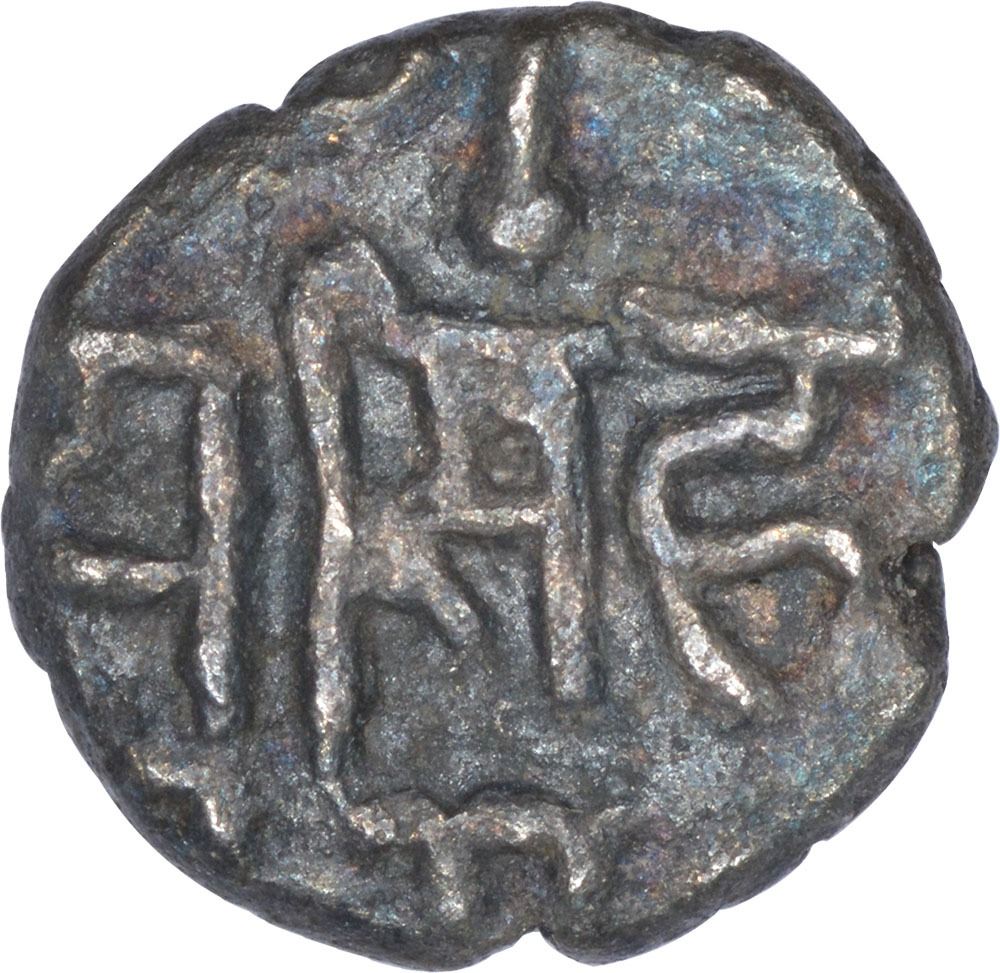 Chalukyas of Gujarat, Siddharaja Jayasimha, Silver Dirham, Obv: elephant facing to right,Rev: nagari legend srima jaya simha in two lines, 0.35g, 6.86mm, (Deyell #163a), about extremely fine, Rare.Complete details of elephant within the dotted circle on such a small coin.