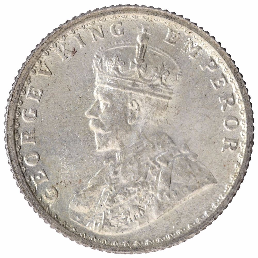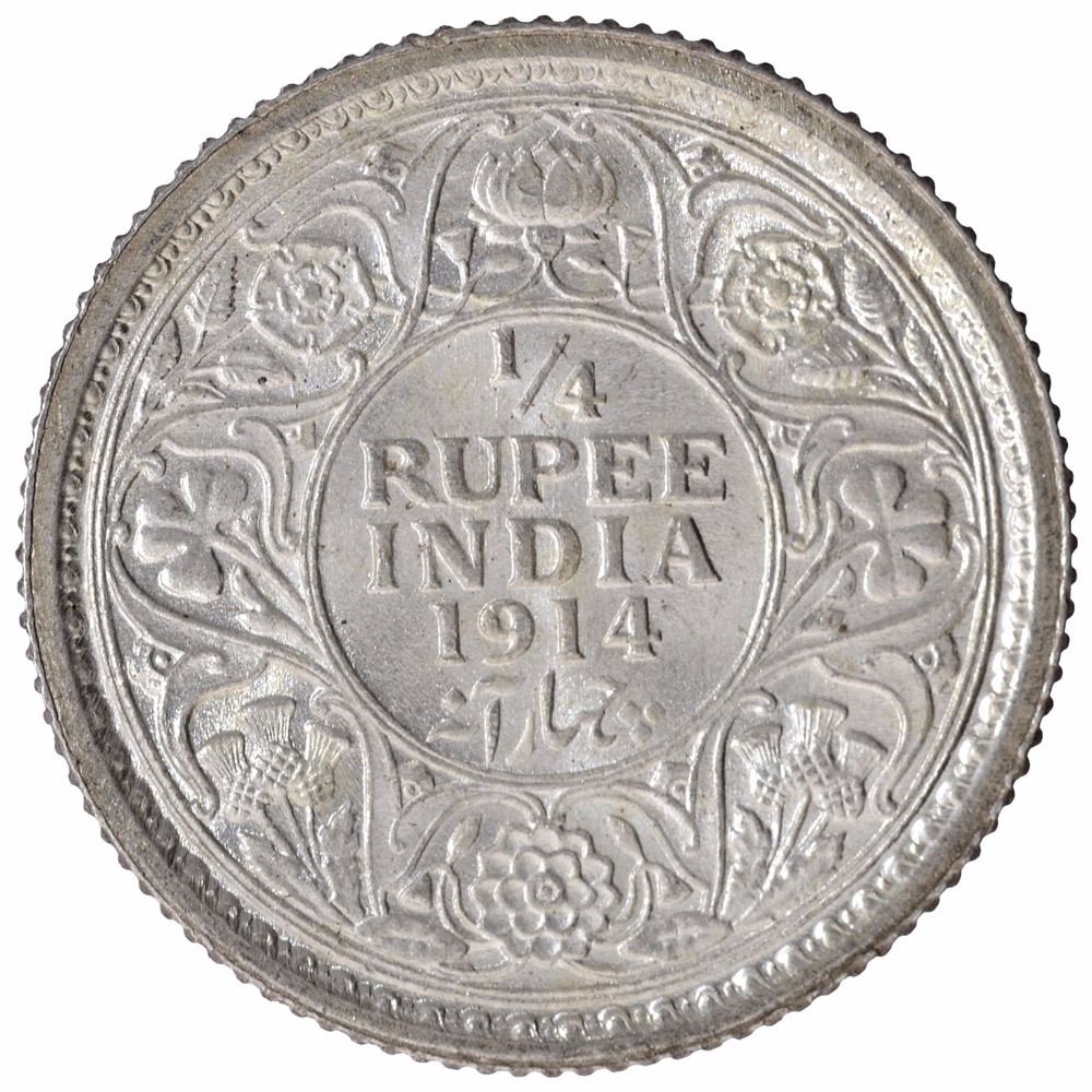 Silver One Quarter Rupee Coin of King George V of Calcutta Mint of 1914.