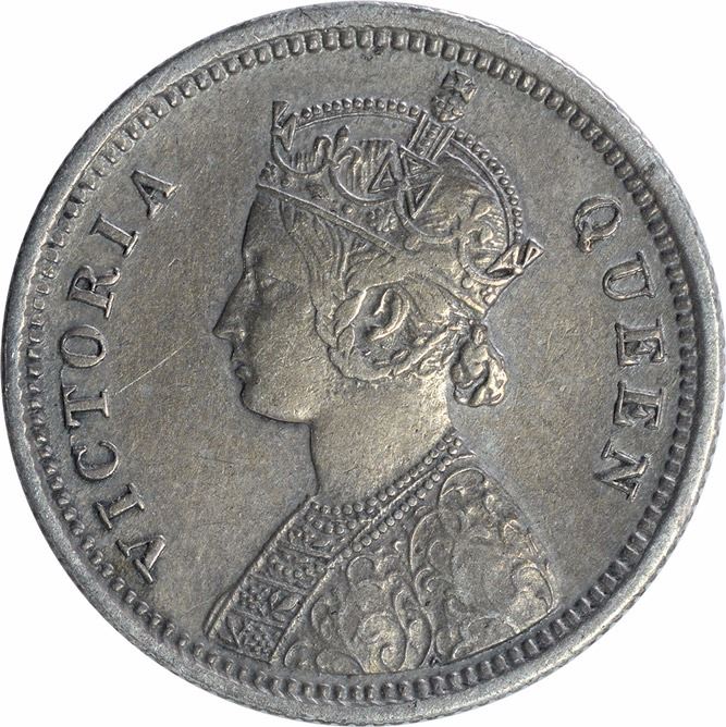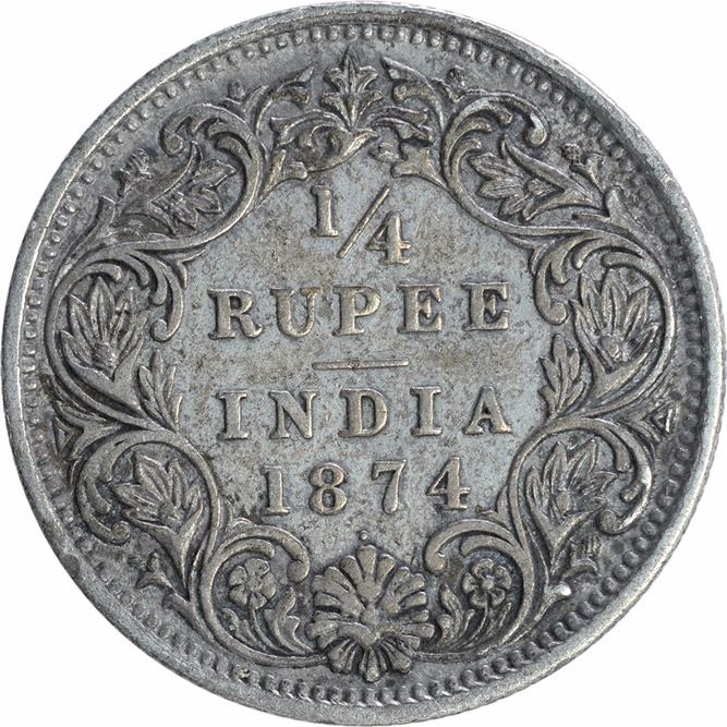 Silver One Quarter Rupee Coin of Victoria Queen of Bombay Mint of 1874.