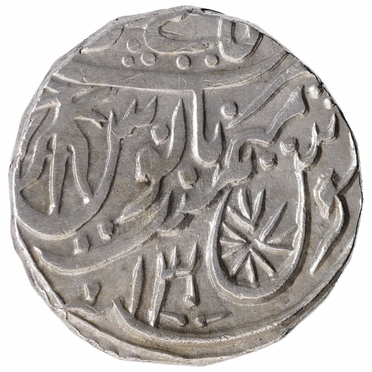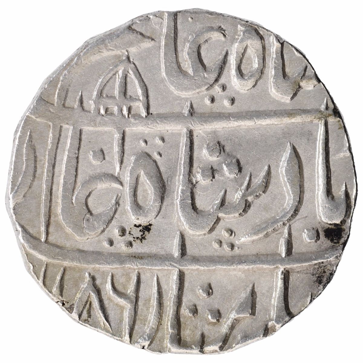Rohilkhand Kingdom, KashipurMint,Silver Rupee,AH 1186/13 RY, In the name of Shah Alam II, Obv:sikka mubarak shah alam badshah ghazi, umbrella on top,Rev:sanah julus, manus maimanat zarb on top inverted trishulmark in manus of lettersin,11.09g, 21.99mm,Unlisted,choiceextremely fine,ExtremelyRare.
