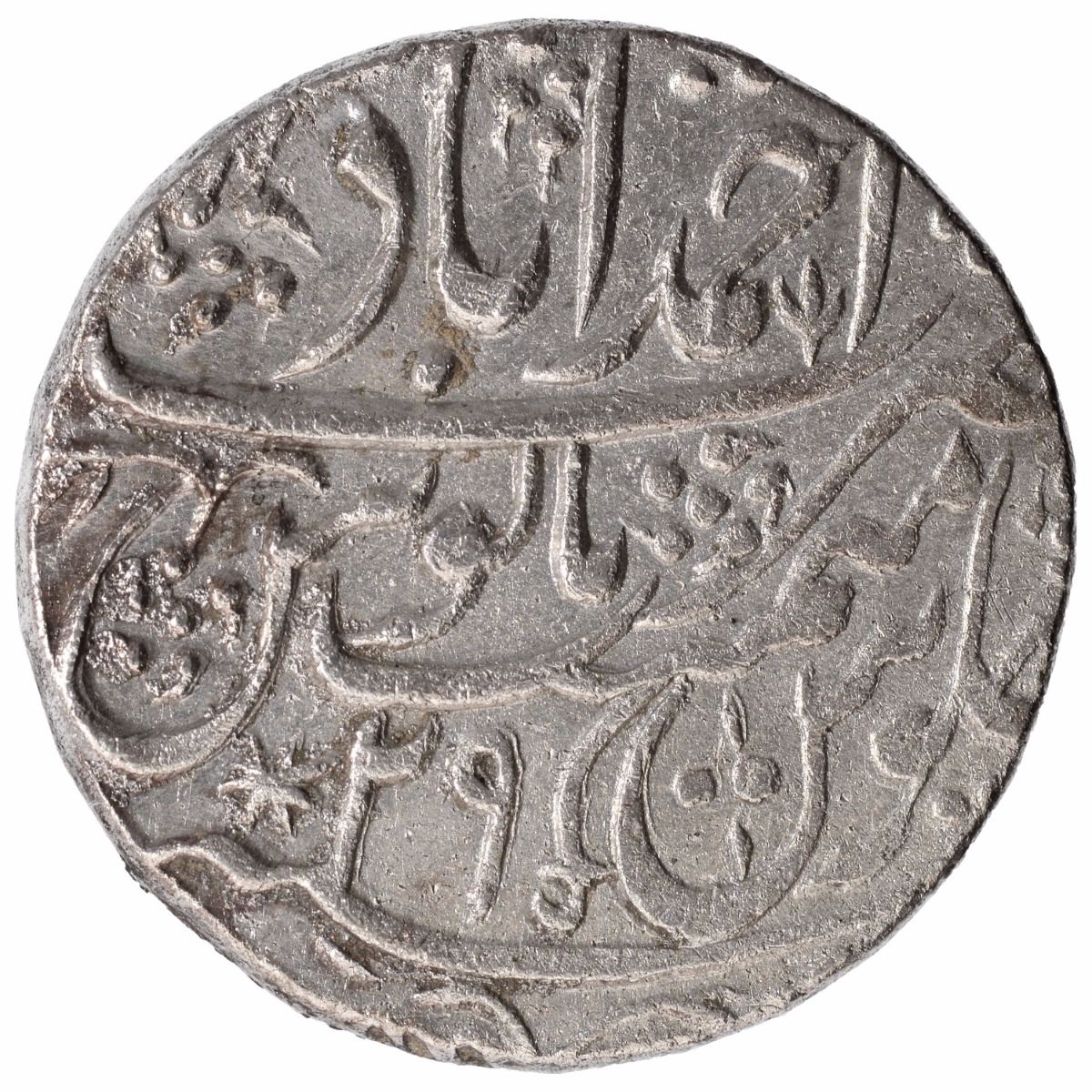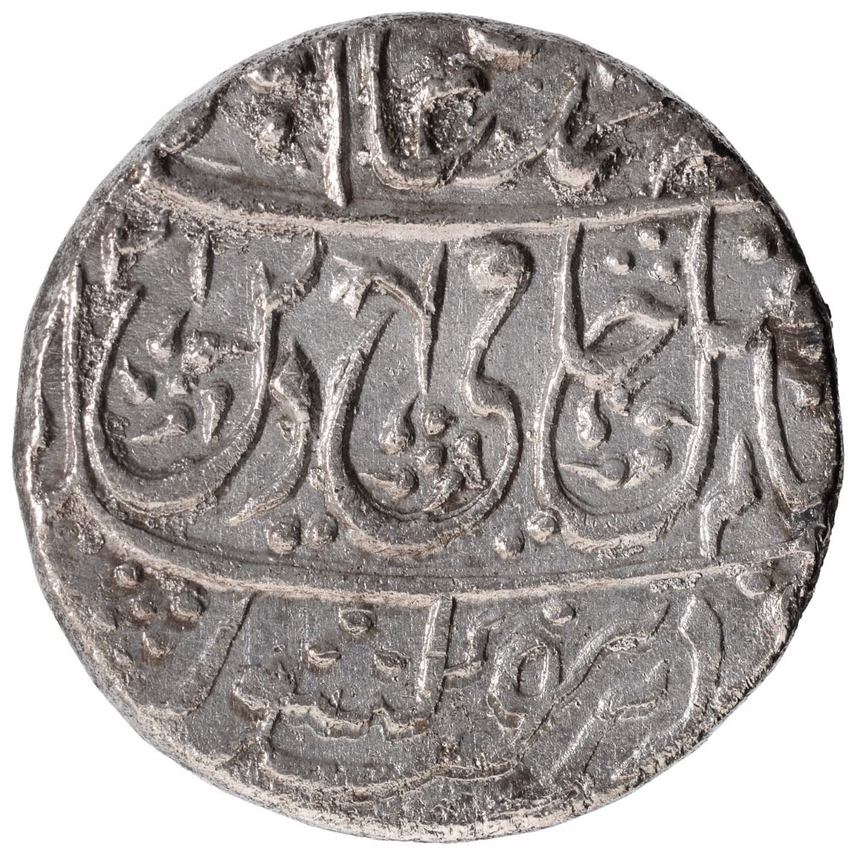 Bedar Bakht, Ahmadabad Mint (Ghausgarh), Silver Rupee, AH (1)201/29 RY, In the name of Shah Alam II,Obv: saya-e-fazle elah couplet, Rev: sana julus zarb,complete mint name visible on top sword mark at bottom, 11.12g, 21.32mm, (KM # 738), about extremely fine, Very Rare.