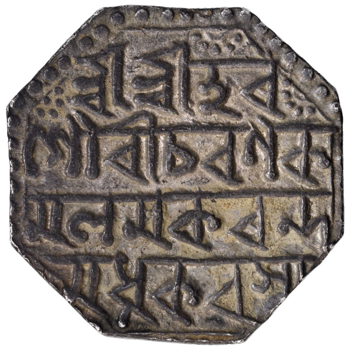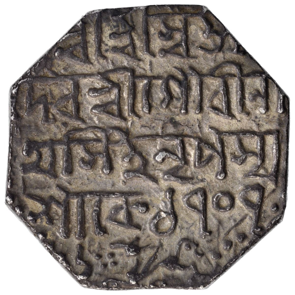 Assam, Gaurinatha Simha, Silver Rupee,SE 1707,Obv:assamese legend srisri hara / gauri charana ka / mala makaranda / madhukarasya, dots upper left, upper right and top right, Rev:assamese legend sri srimat sva / rga deva sri gau / rinatha simhasya / sake 1707, year 6, four dots in front of lion, 11.5g, 22.32mm, (S.K.Bose # R 39.1), about extremely fine.