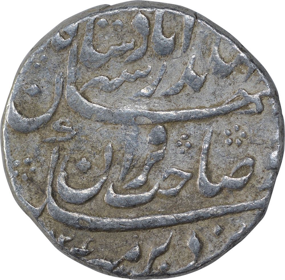 Jahandar Shah, SuratMint, Silver Rupee,Ahad RY,Obv:saheb-e-qiran couplet, ba zad sikka bar meh, chu sahab qiran, jahandar shah, badshahe jahan,Rev:sana julus, zarb at bottom,11.48g, 23.25mm,(KM # 364.19),about very fine.