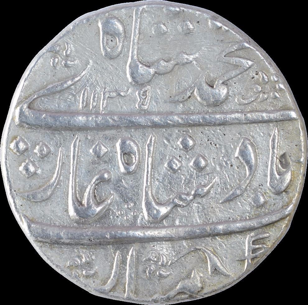 Muhammad Shah, Machhalipattan Mint, Silver Rupee, AH 1135/5 RY, Excellent Strike, Obv: sikka mubarak badshah ghazi, Rev: sana julus zarb, 11.38g, 23.5mm, (KM # 436.42), about extremely fine,Scarce.
