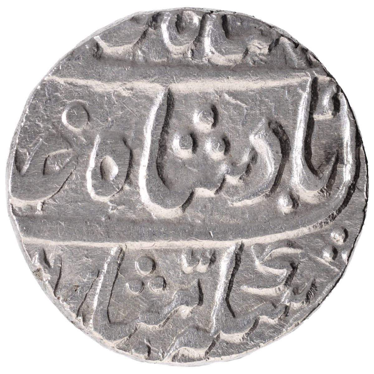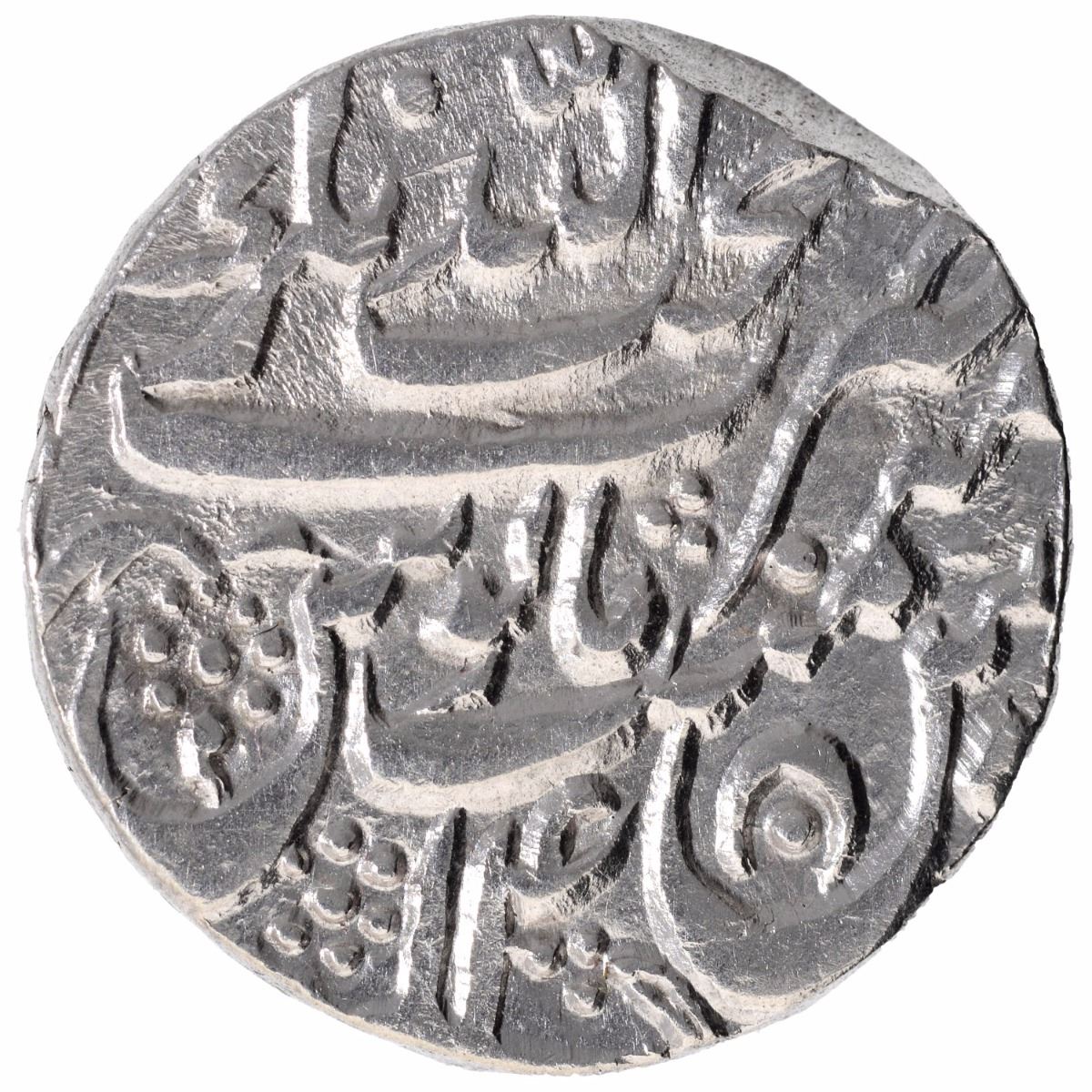 Rohilkhand, Muhibullanagar Mint, Silver Rupee, 14 RY, In the name of Shah Alam II, Obv: sikka mubarak badshah ghazi, Rev: sana julus zarb, inverted nun in julus of letter sin, complete mint name muhibulla nagar visible on top, 11.0g, 20.62mm, Unlisted Variety, about extremely fine with dotted motifs, Extremely Rare.