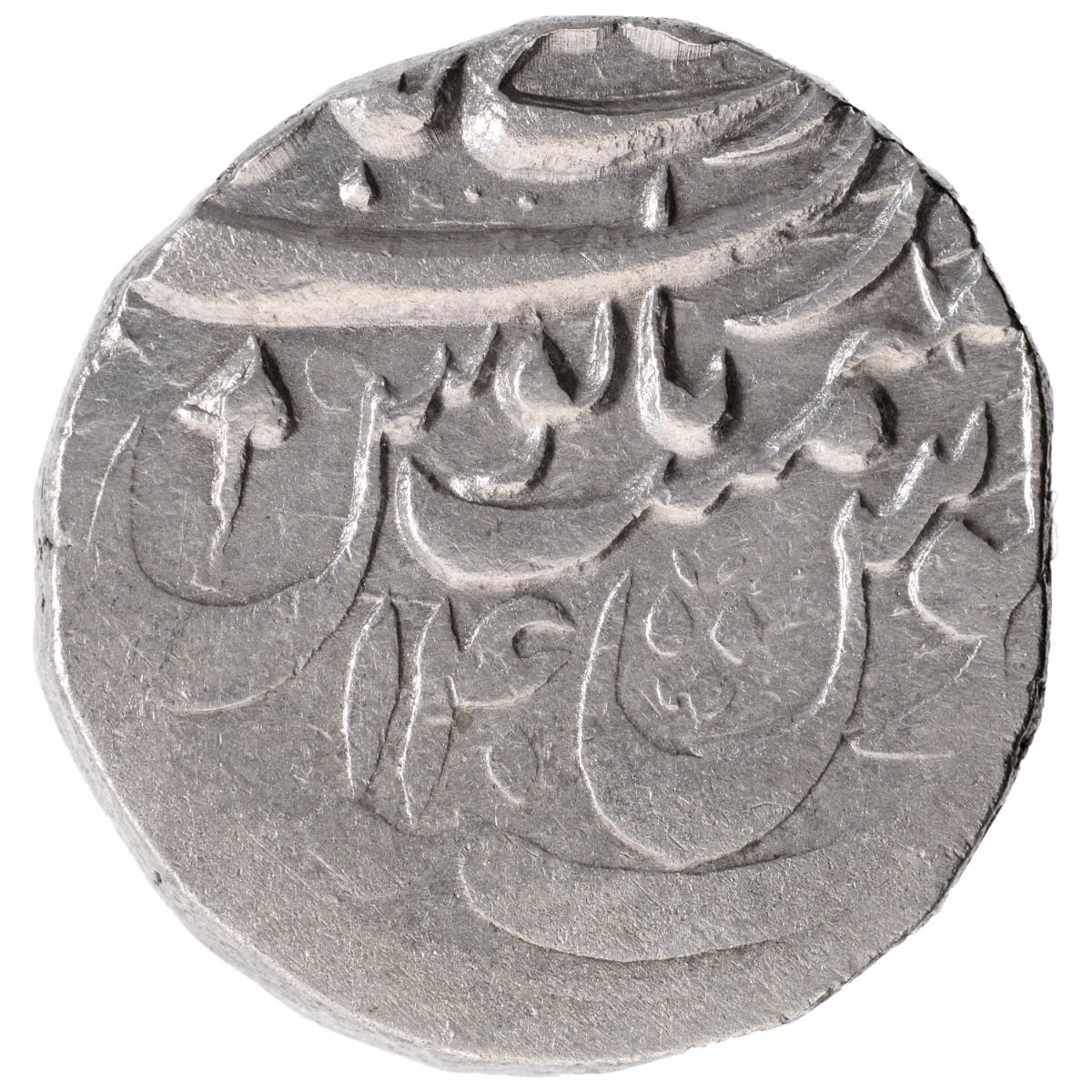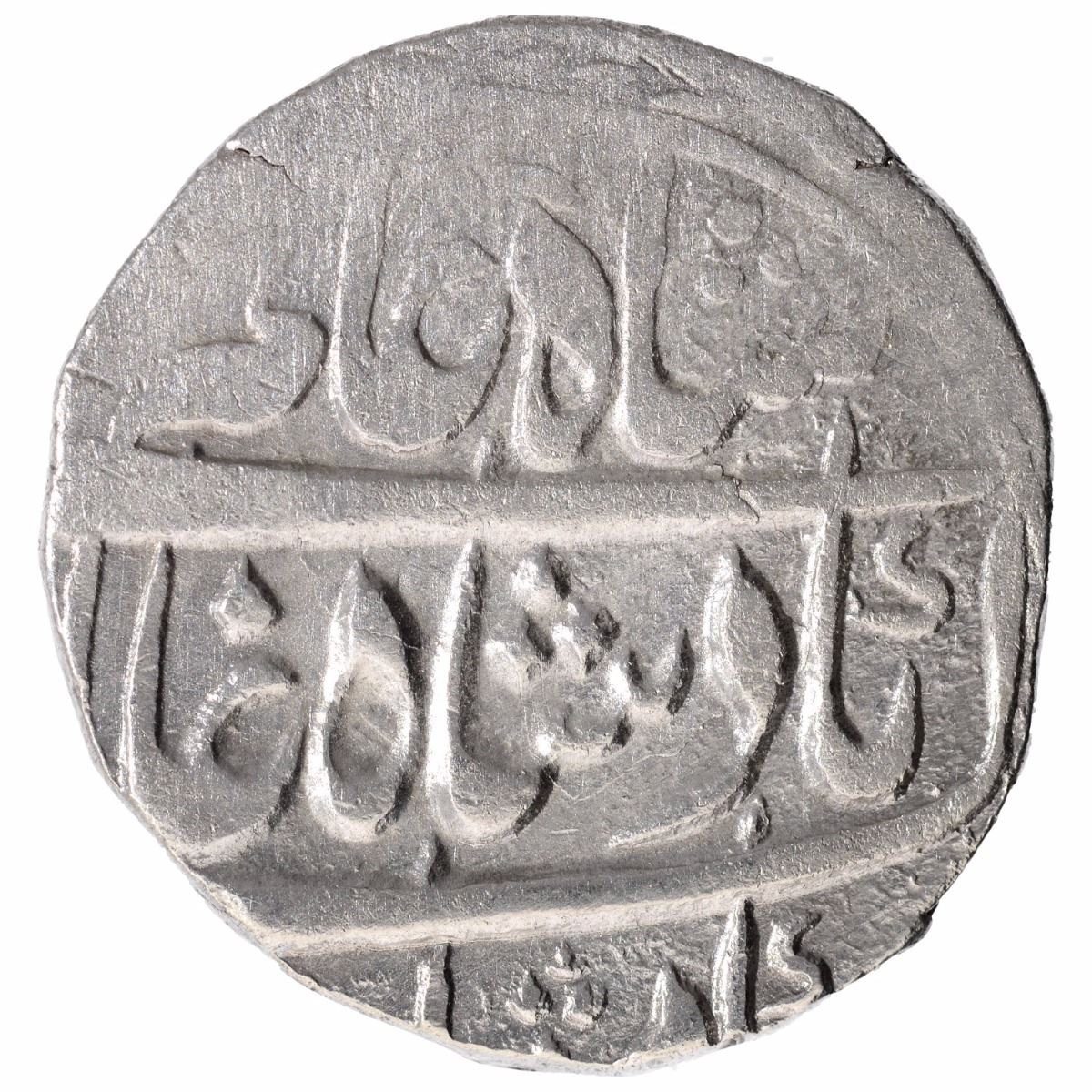Rohilkhand Kingdom, Murtazabad Mint, Silver Rupee, 14 RY,In the name of Shah Alam II,Obv: sikka mubarak shah alam badshah ghazi,Rev: sanah julus, manus maimant, zarb on top arrow mark in manus of letter sin,11.00g, 21.88mm, Unlisted, about very fine, Rare.