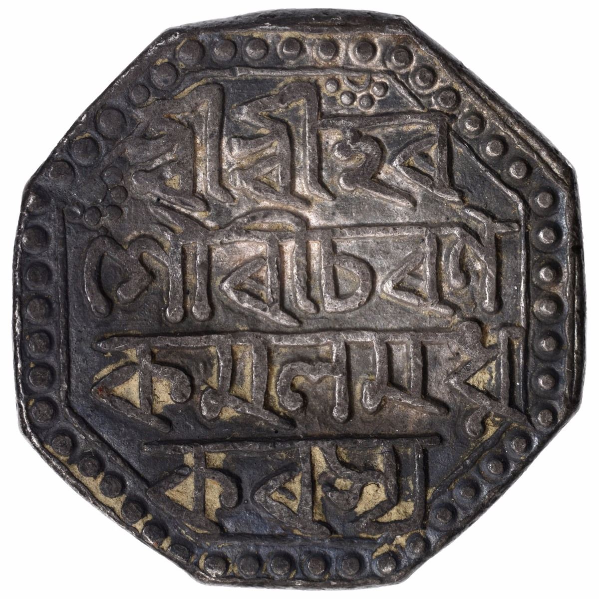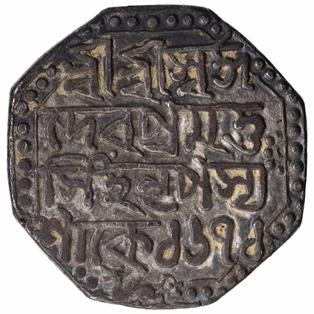 Assam, Pramatta Simha, Silver Rupee, SE 1671, Obv: assamese legend sri sri hara/guari charana/kamala madhu/karasya, arcs of dots upper left and top right, Rev:assamese legend sri sri pra/matta simha/nrpasyasake 1671, lion facing to left,11.4g, 24.34mm, (S.K,Bose N #12.2),about very fine.