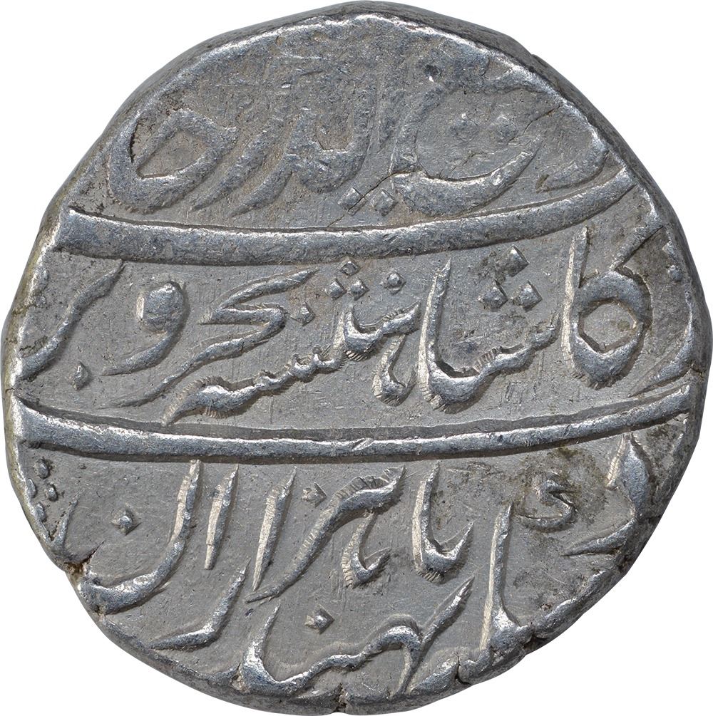 Rafi-Ud-Darjat, ShahjahanabadDar-ul-Khilafat Mint,Silver Rupee,Obv:ba hazaran barkatcouplet,sikka-e-zad bahind bahazaraan barkaat shahen shahe bhre-o-bar rafiuddarjaat,Rev:sana julus, zarb,11.34g,20.4mm,(KM # 405.19),about very fine,Scarce.