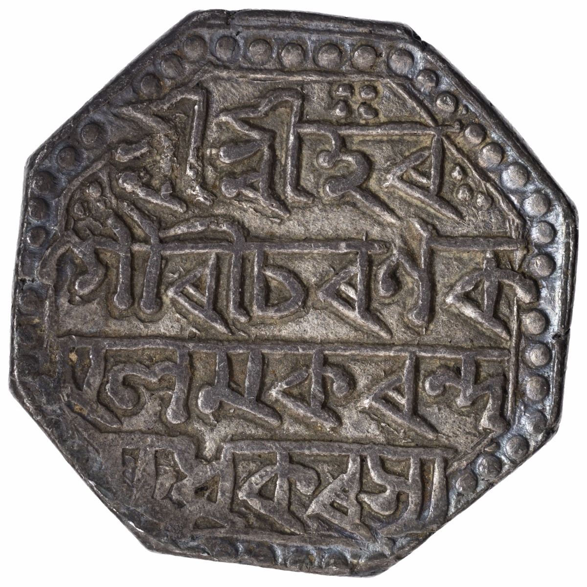 Assam, Rajesvara Simha, Silver Rupee, SE 1683, Obv: assamese legend sri sri hara/gauri charana ka/mala makaranda/madhukarasya, four dots at top, Rev:assamese legend sri sri svaraga/deva sri rajesva/ra simha nrpasya/sake 1683, winged lion running below left,11.4g, 22.95mm, (S.K.Bose # O45.1), about extremely fine.