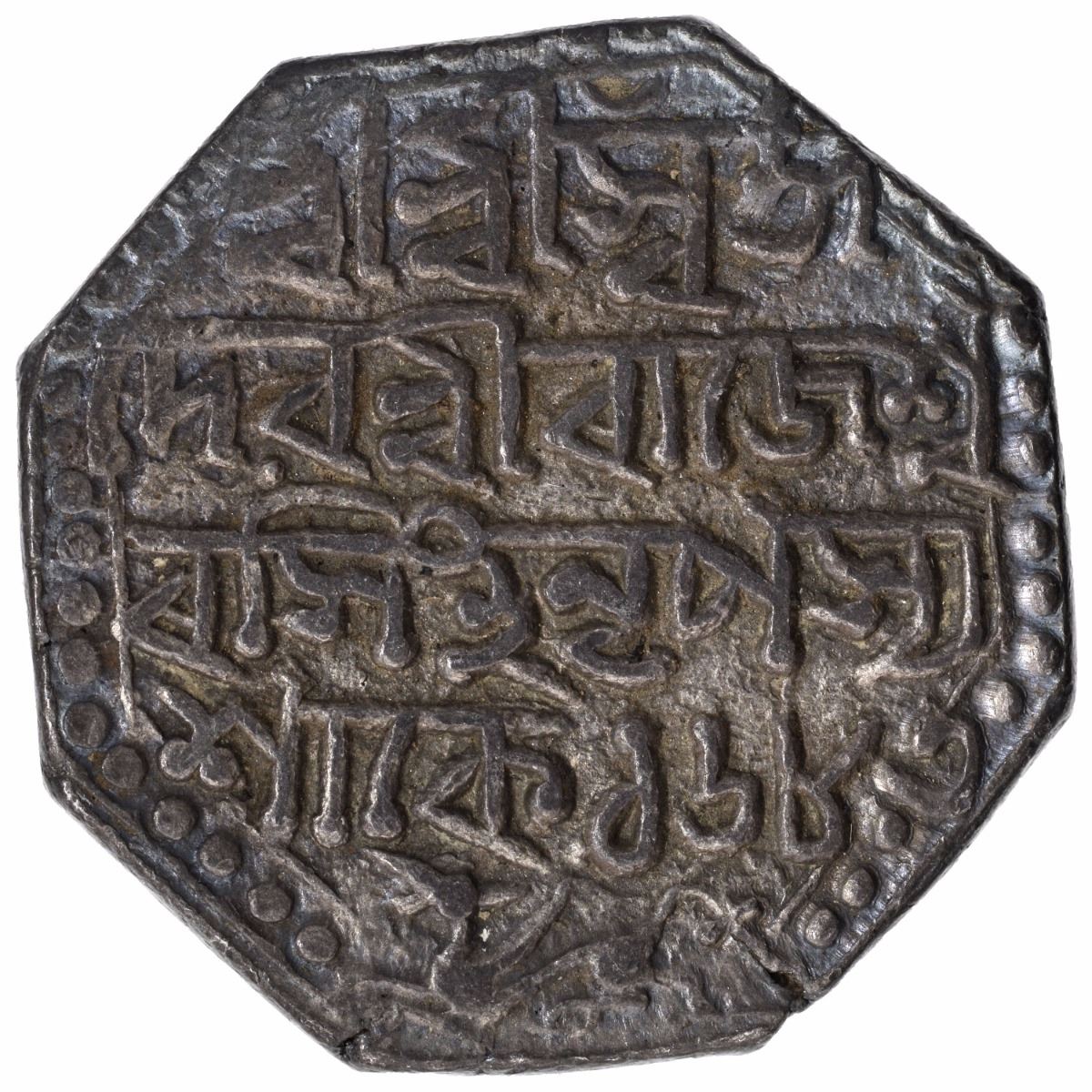 Assam, Rajesvara Simha, Silver Rupee, SE 1683, Obv: assamese legend sri sri hara/gauri charana ka/mala makaranda/madhukarasya, four dots at top, Rev:assamese legend sri sri svaraga/deva sri rajesva/ra simha nrpasya/sake 1683, winged lion running below left,11.4g, 22.95mm, (S.K.Bose # O45.1), about extremely fine.
