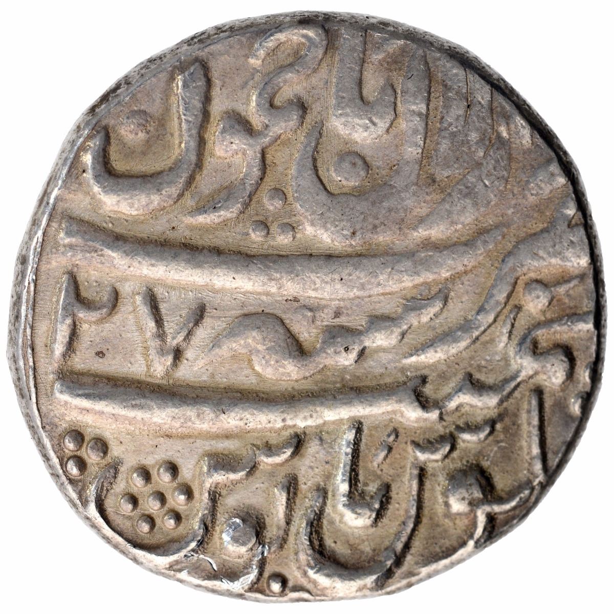 Jammu, Dogra Raja Ranjit Dev, Dar-ul-Aman Jammu Mint, Silver Rupee,VS 1841/27 RY,Obv:ranjit dev abad gird couplet chhatra on top,Rev:sana julus, zarb on top dar-ul-aman jammu,11.6g, 24.49mm,(KM # 10.1),about extremely fine, Rare.