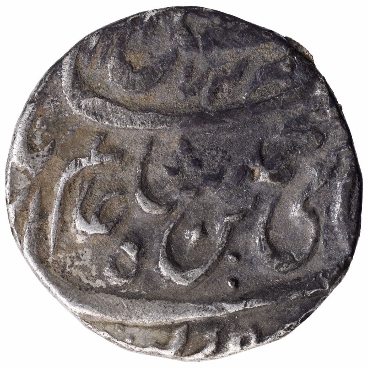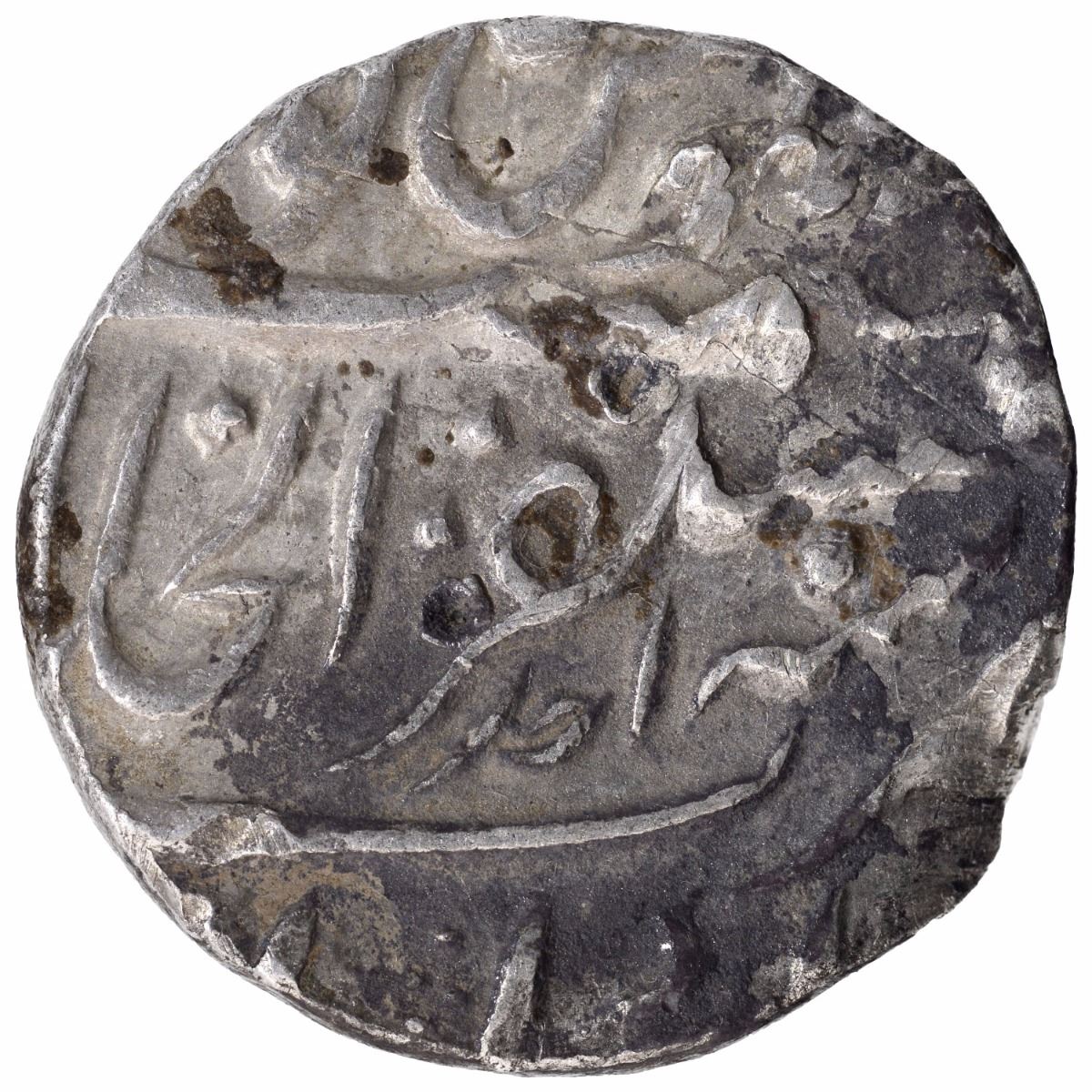 Shah Alam II, Akbarabad Mustaqir-ul-Khilafa Mint, Silver Rupee, AH 1174/Ahad RY,Pre Panipat Issue, Obv: saya-e-fazle elahcouplet, letter dal is missing in hami (d)inRev: sana julus zarb at bottom, 11.35g, 24.06mm, (Similar to KM # 490)Unlisted variety,about very fine,Scarce.