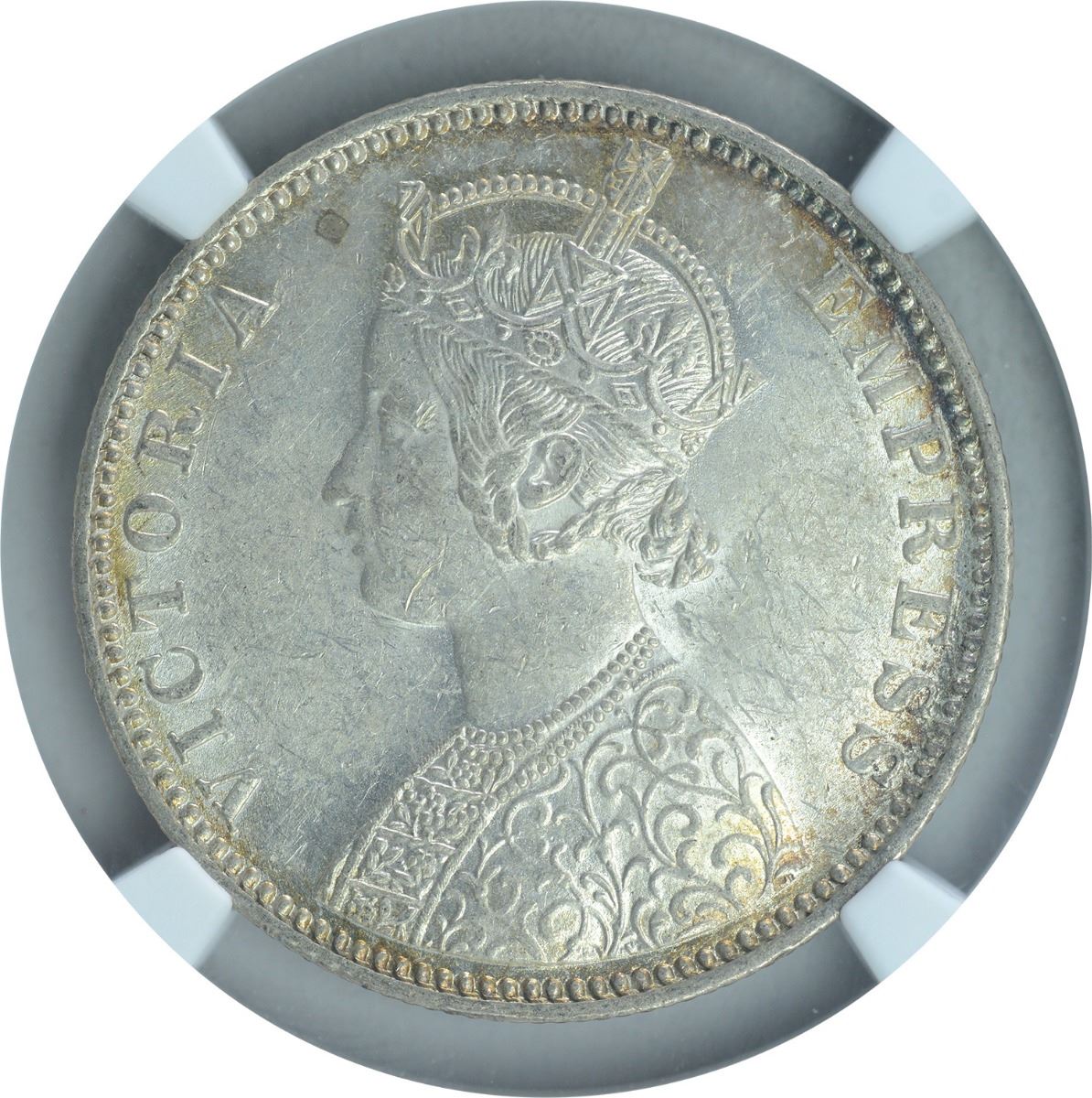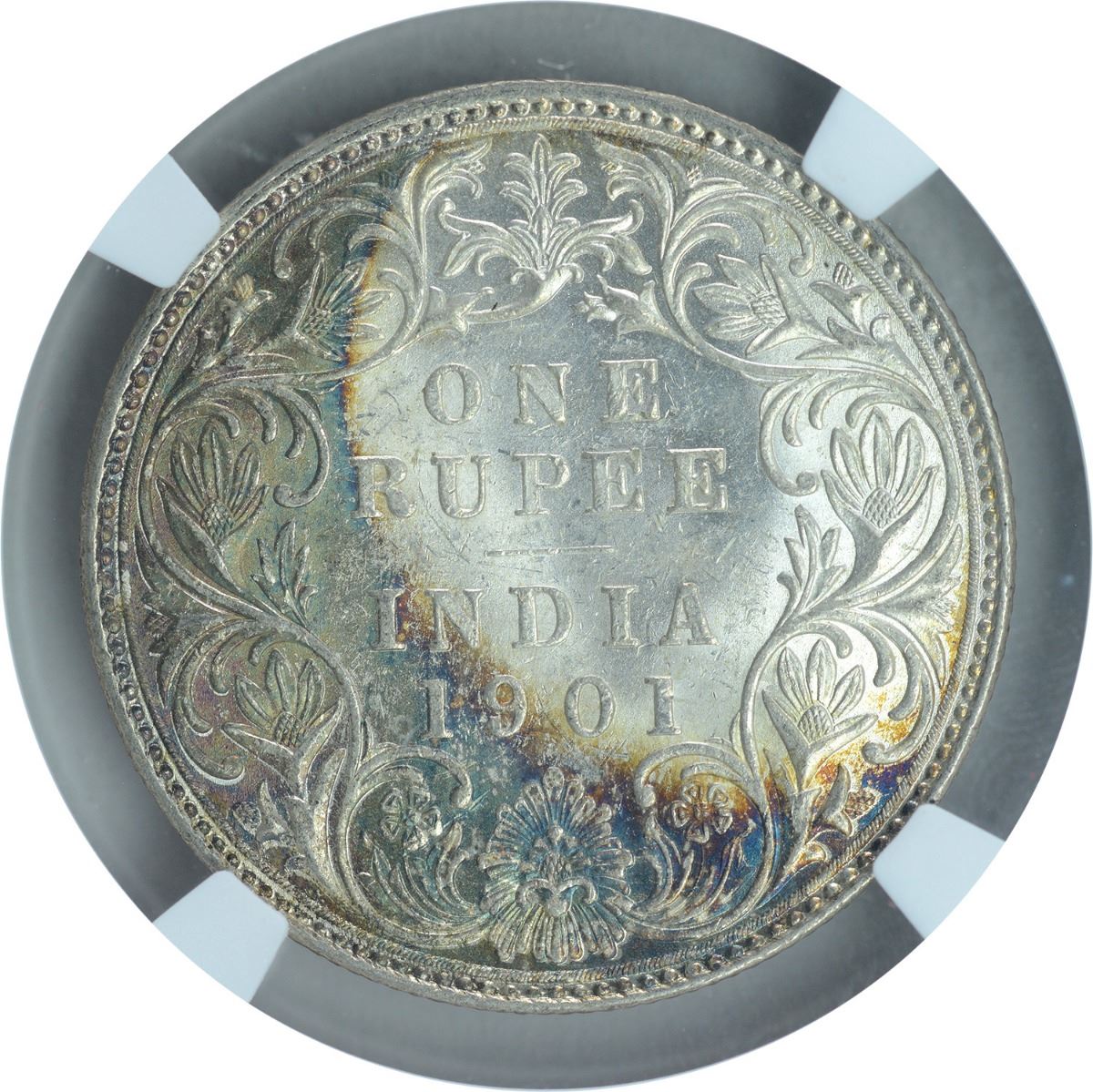 1901, Victoria Empress, Silver Rupee, Bombay Mint, A3/I/B incuse, (PR # 187), graded slabbed by NGC as MS 61, graded low, with rainbow toning.